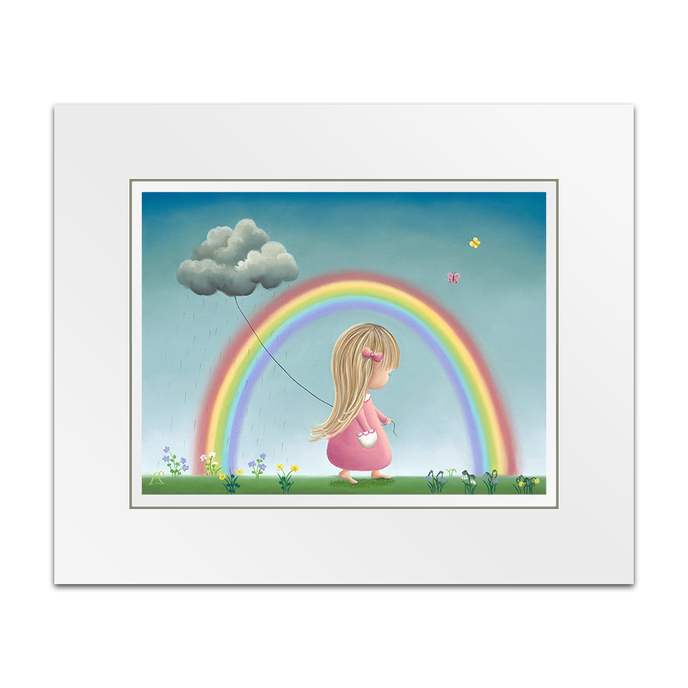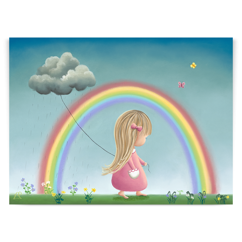 On the outside, her little black cloud is full of rain, which the poor wilting flowers are desperate for. The sun is just hiding behind that cloud, and it’s produced the most wonderful rainbow, which the butterflies are loving.
