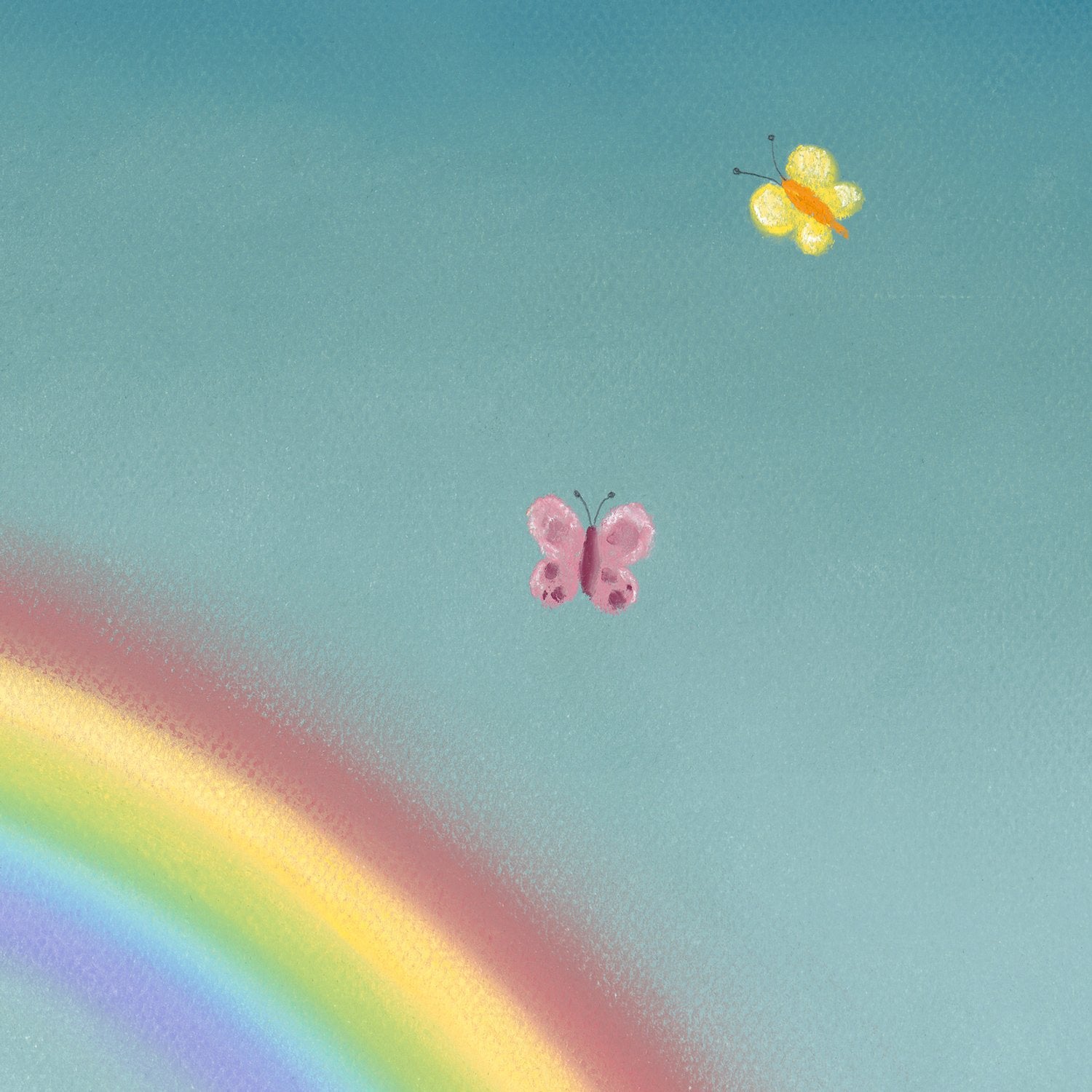 She is deep in thought, but this is on the inside. On the outside her little black cloud is full of rain which the poor wilting flowers are desperate for, the sun is just hiding behind that cloud, and it’s produced the most wonderful rainbow, which the butterflies are loving.