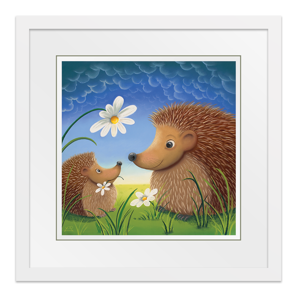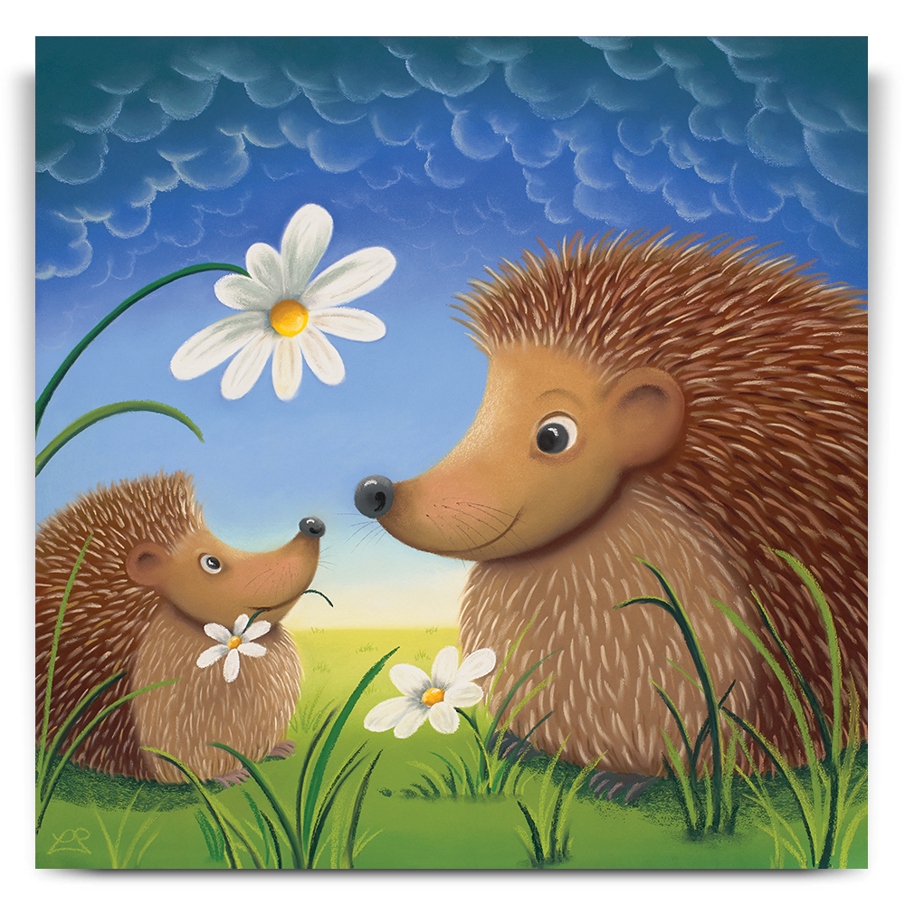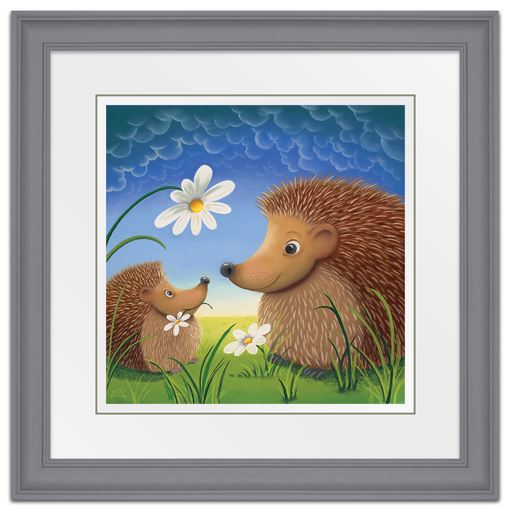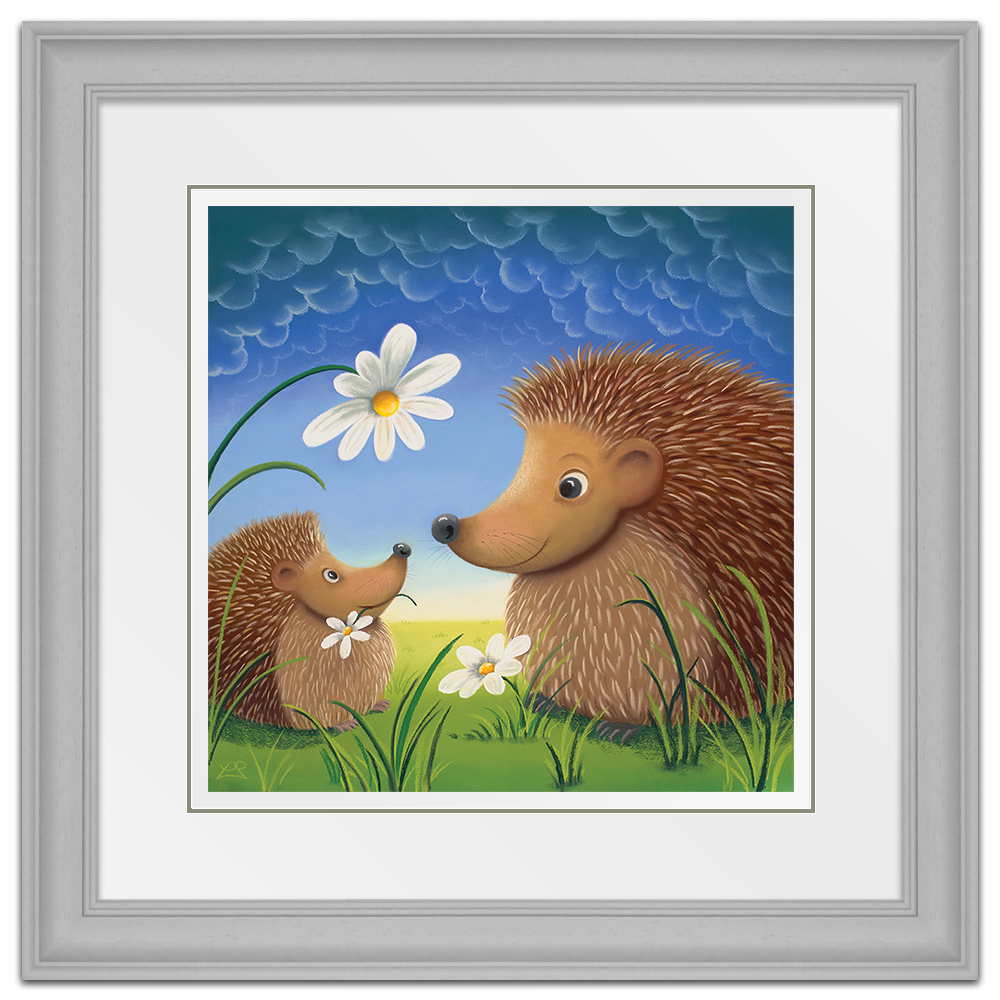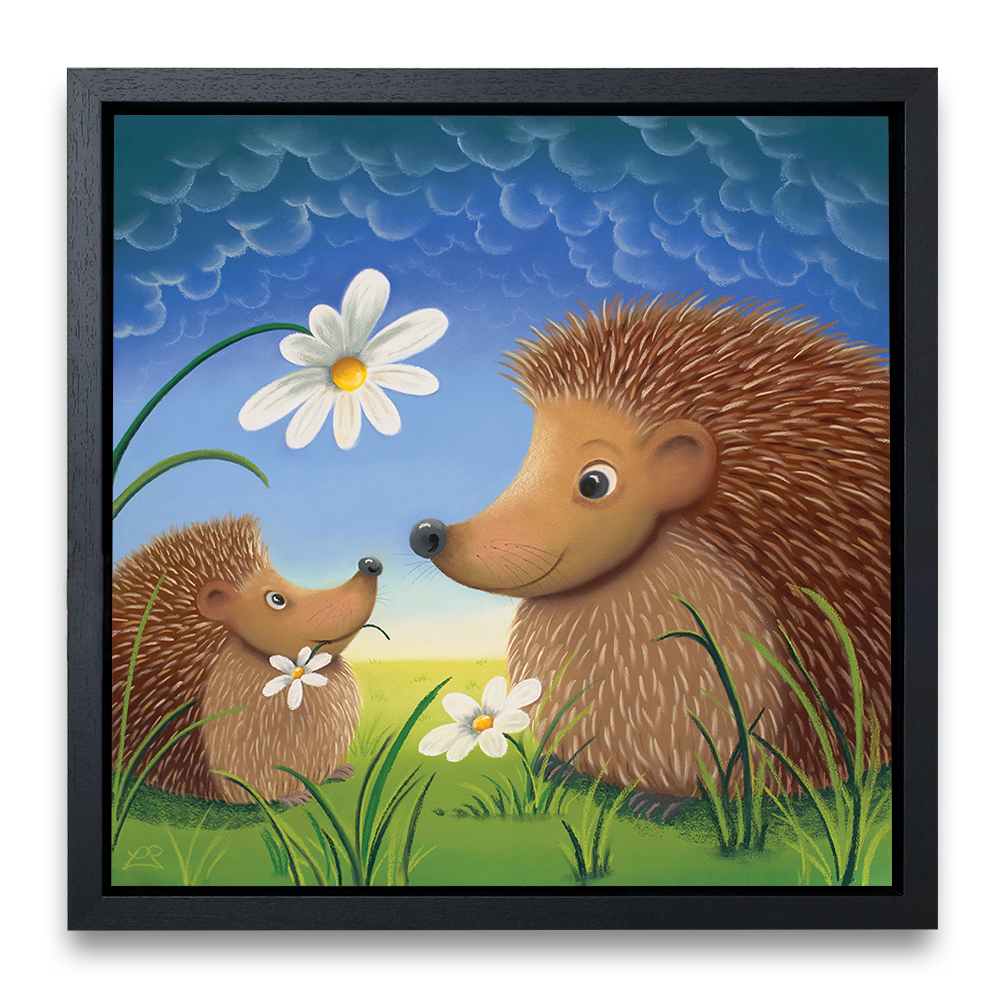 This painting of two hedgehogs shows a baby one holding a daisy in its mouth and offering it as a gift to the adult. Here you can imagine a child presenting a gift to its Mum, Dad, Grandparent, teacher or just somebody special to them. Its a painting about the giving and receiving of a gift and hopefully the look I have painted on the face of the receiver shows just how little acts of kindness such as these can really mean so much.