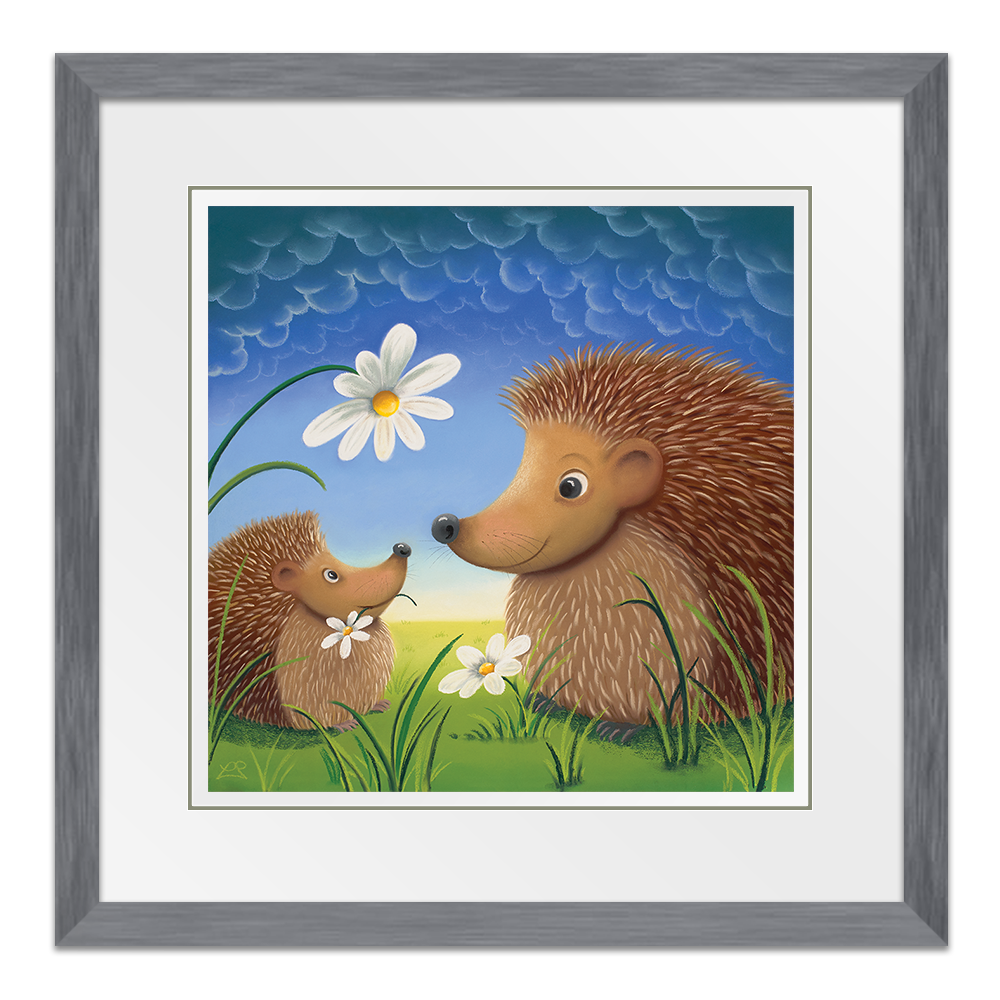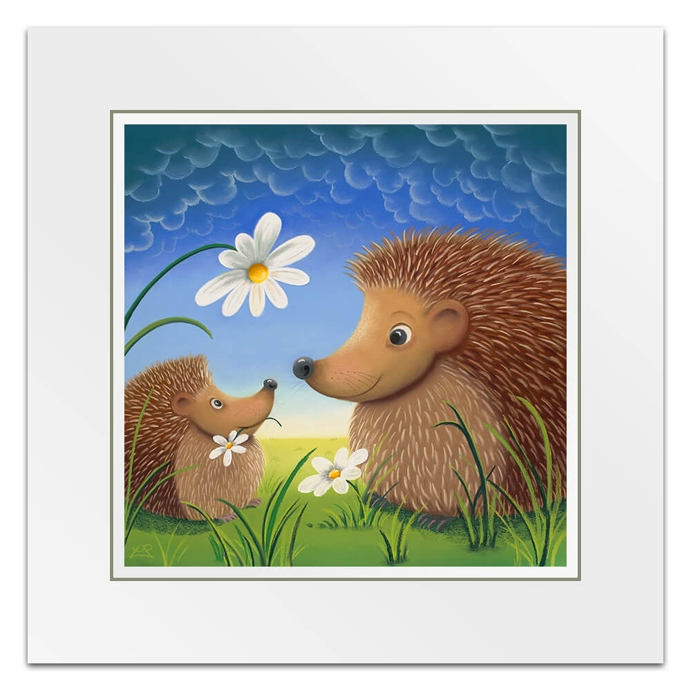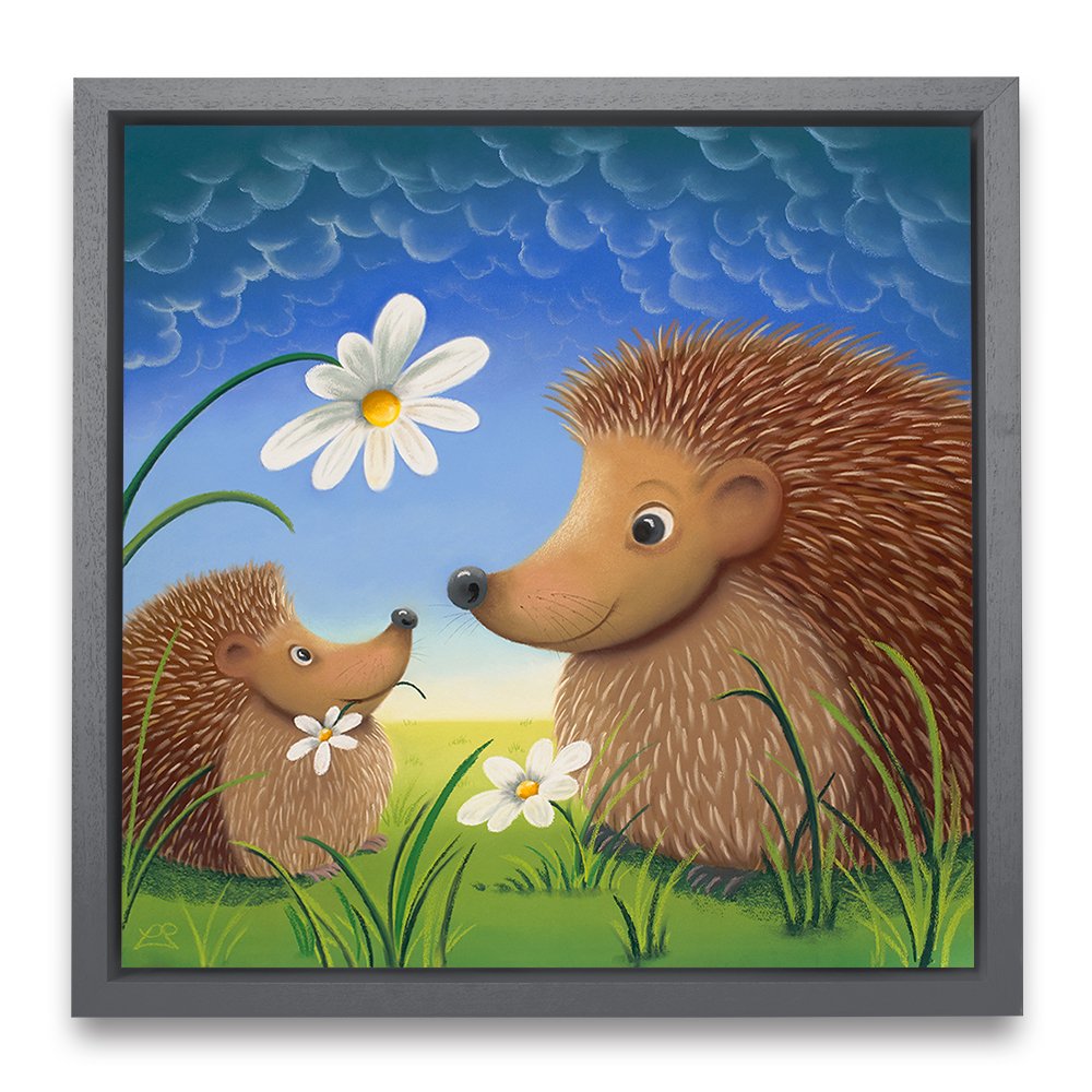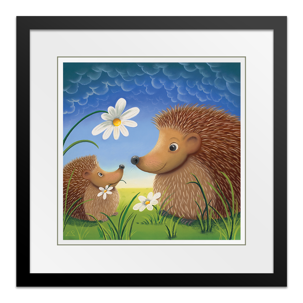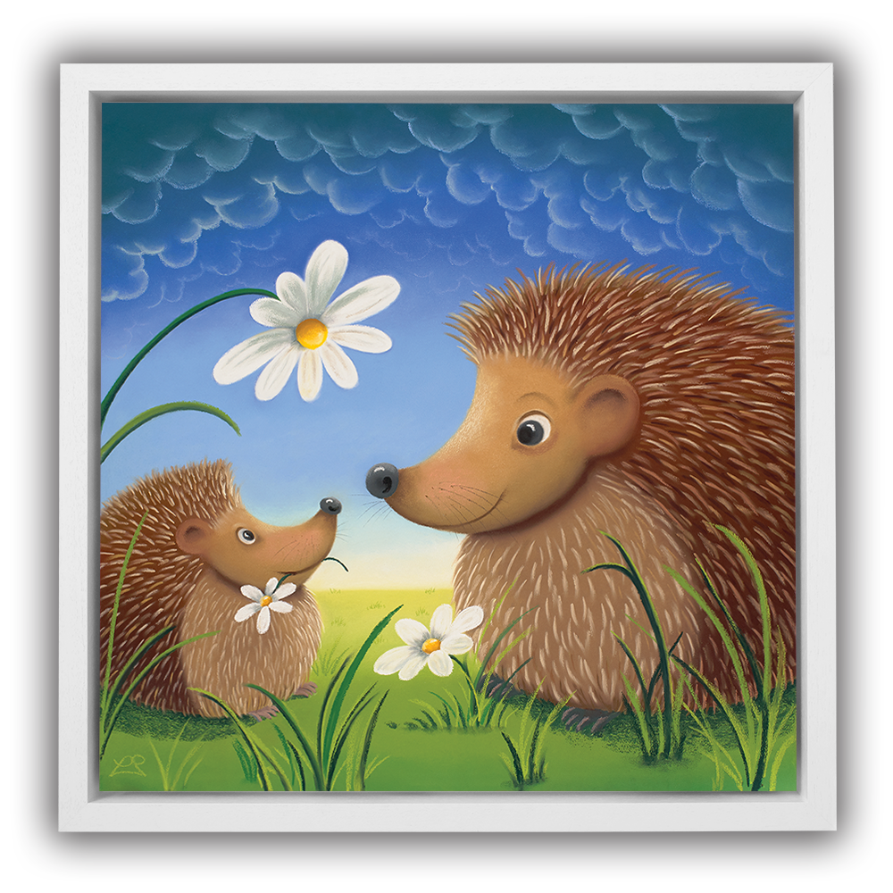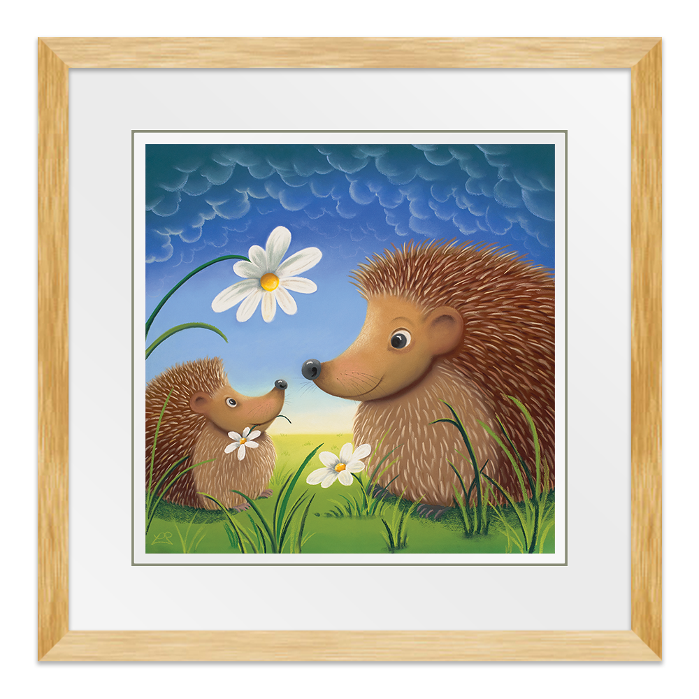 This painting of two hedgehogs shows a baby one holding a daisy in its mouth and offering it as a gift to the adult. Here you can imagine a child presenting a gift to its Mum, Dad, Grandparent, teacher or just somebody special to them. Its a painting about the giving and receiving of a gift and hopefully the look I have painted on the face of the receiver shows just how little acts of kindness such as these can really mean so much.