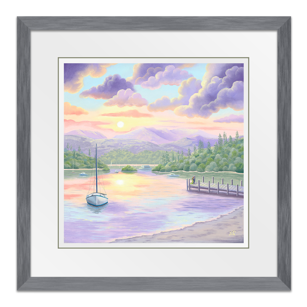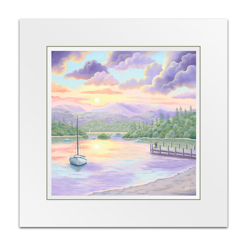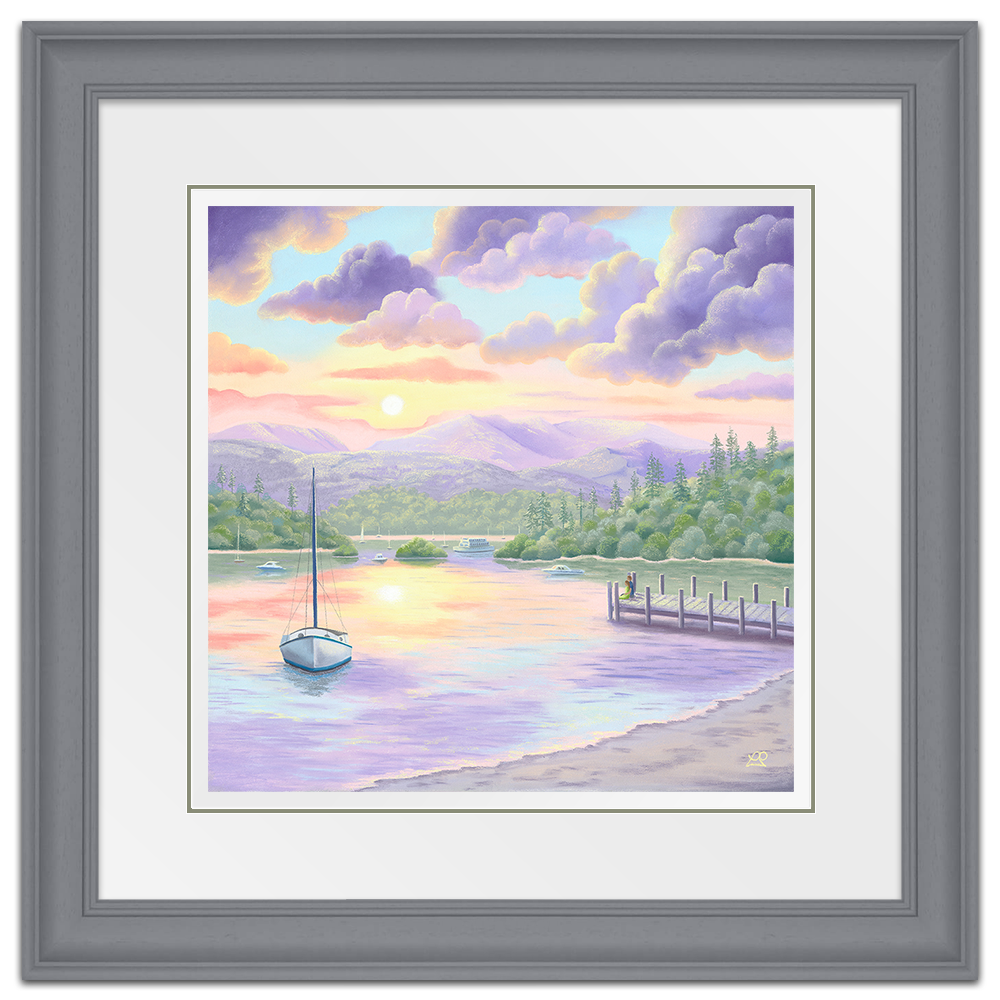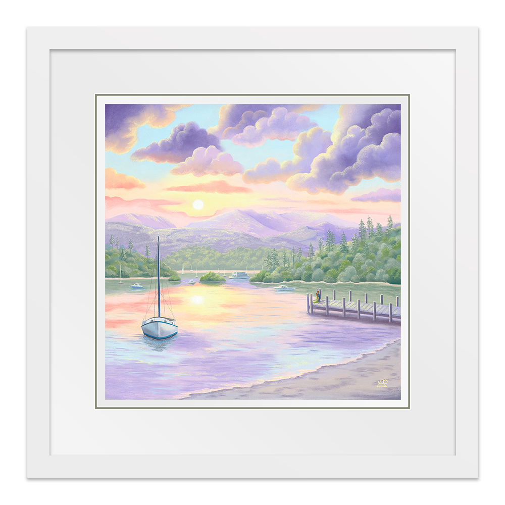 Lake Windermere is bathed in beautiful soft sunlight, casting pastel shades across the waters and creating perfect reflections of a colourful sky. A couple rest at the end of a jetty, taking in the sights and sounds of the life surrounding them. A little piece of paradise to feed the soul.