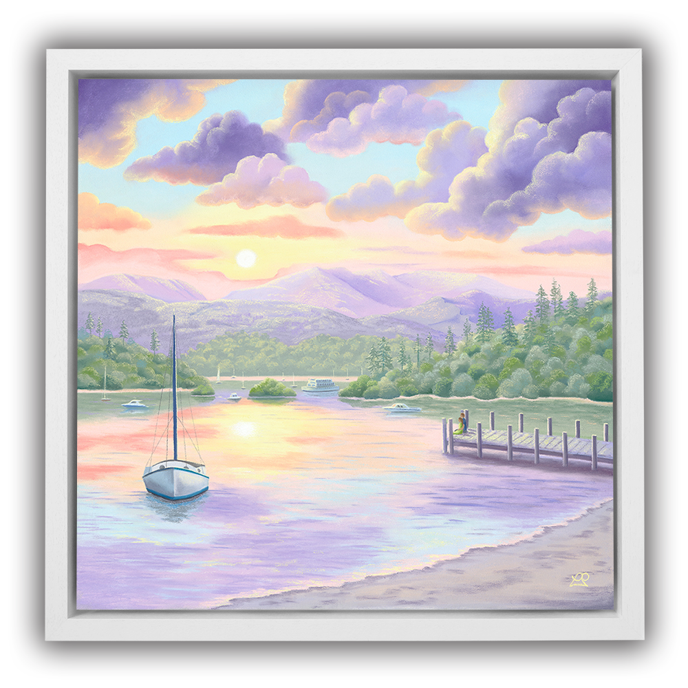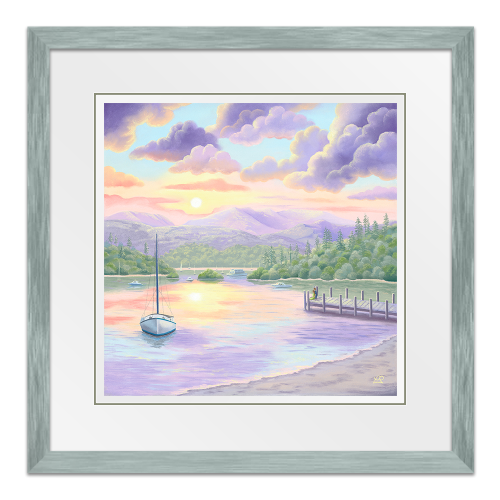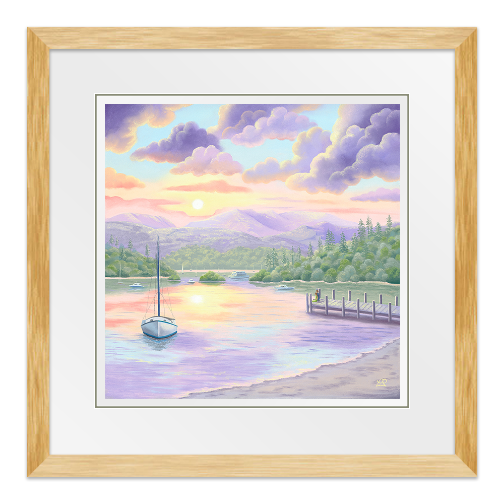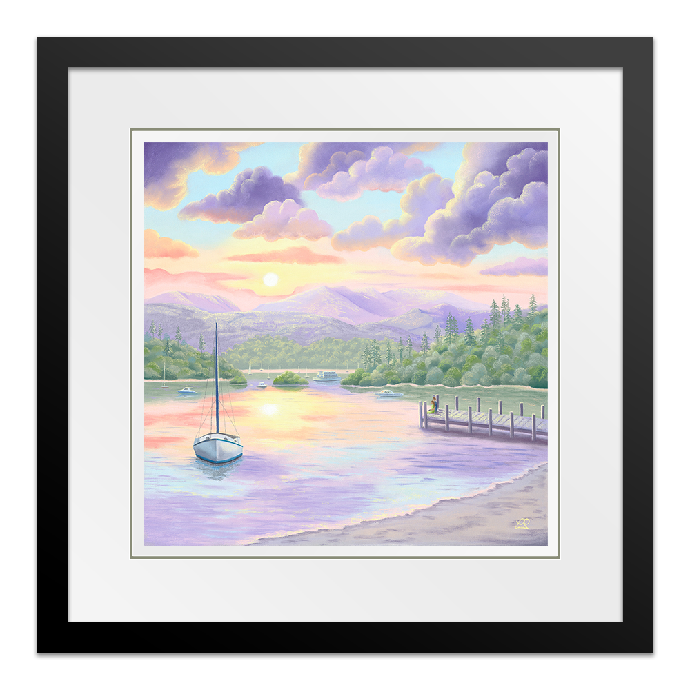 Lake Windermere is bathed in beautiful soft sunlight, casting pastel shades across the waters and creating perfect reflections of a colourful sky. A couple rest at the end of a jetty, taking in the sights and sounds of the life surrounding them. A little piece of paradise to feed the soul.