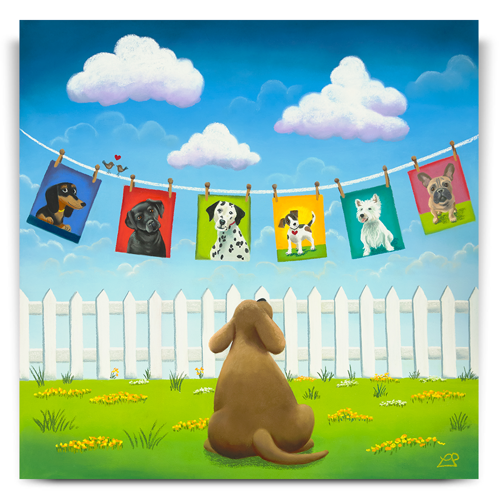 A few years ago, we had a caramel Cocker Spaniel and a Jack Russell. They were such different personalities, but were the best of friends. They inspired me to create this piece. Online Dating is an obvious play on words and a fun and light hearted piece. You can see that the little Jack Russel has caught the eye of the spaniel. It’s love at first sight and the others don’t get a look in!