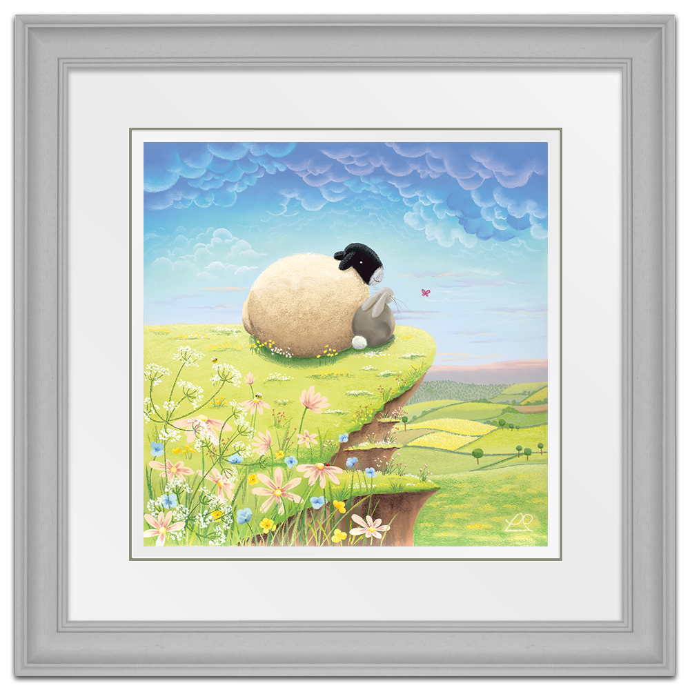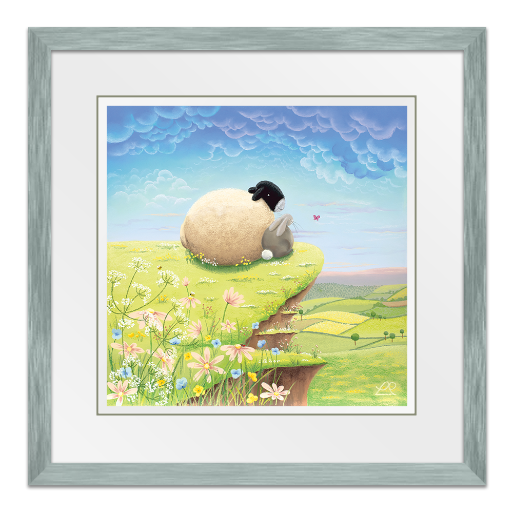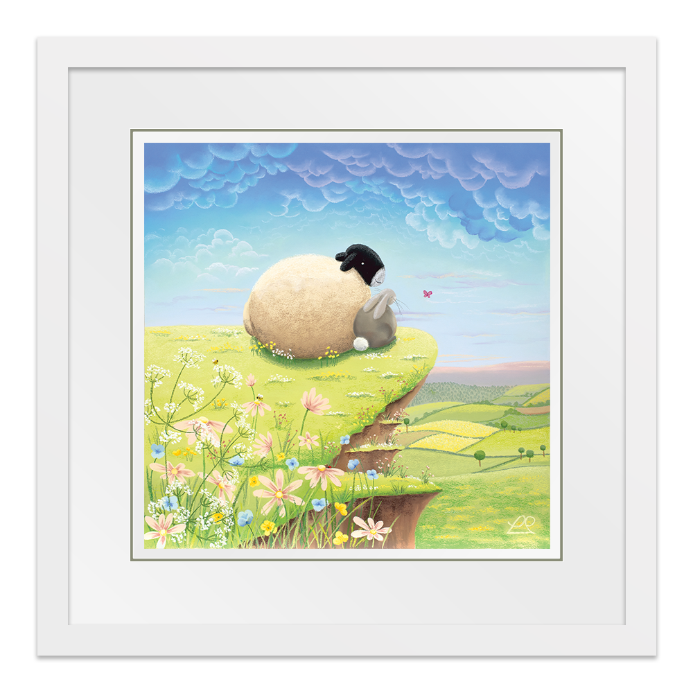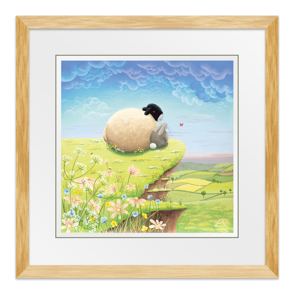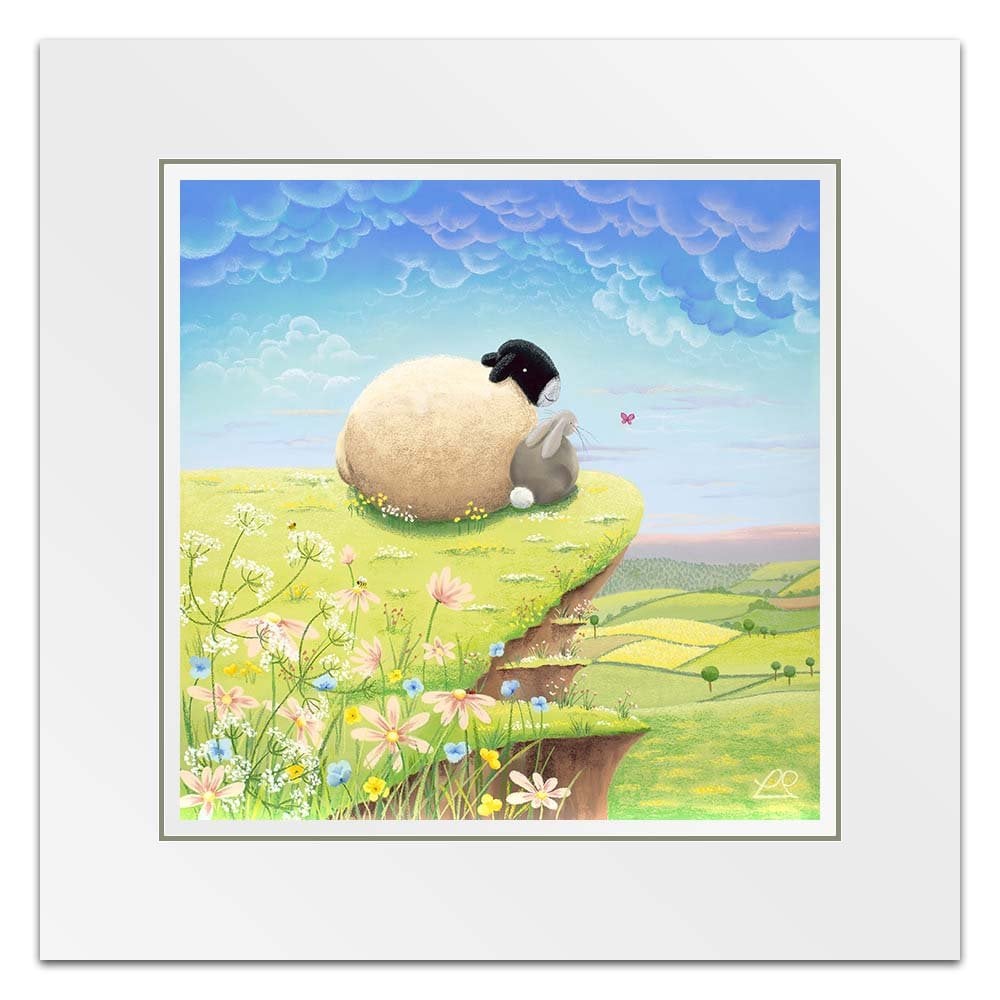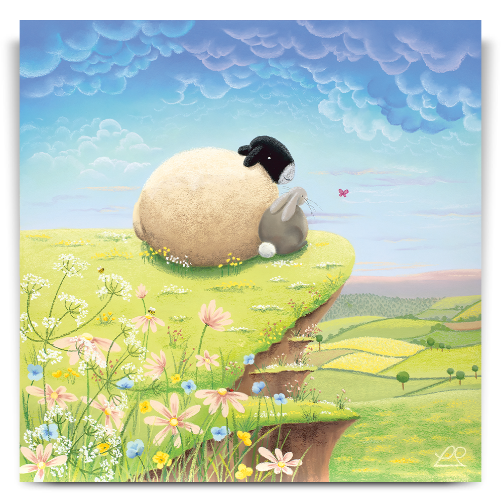 A play on words, these two pals are living 'The High Life' on top of the world, looking down at the beautiful countryside. You can imagine all sorts of conversations about life, taking place between the sheep and the rabbit in this light-hearted piece, perfect for a child's bedroom.