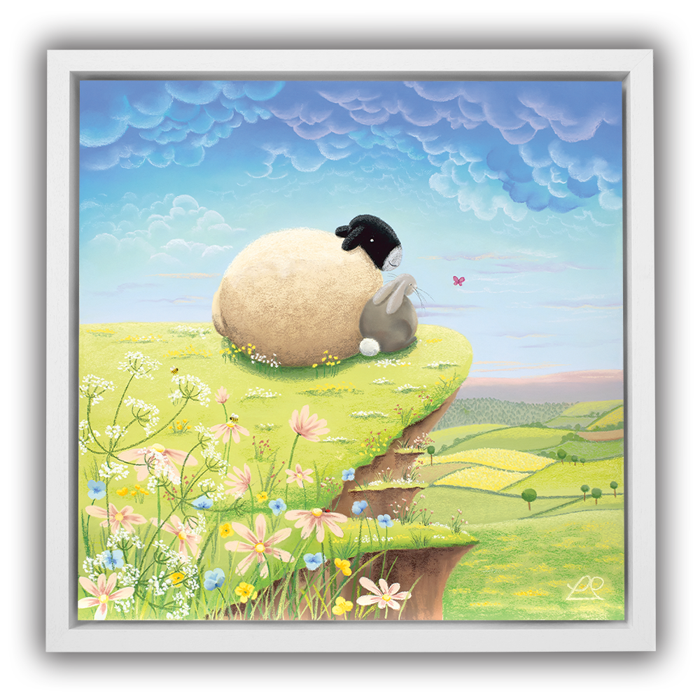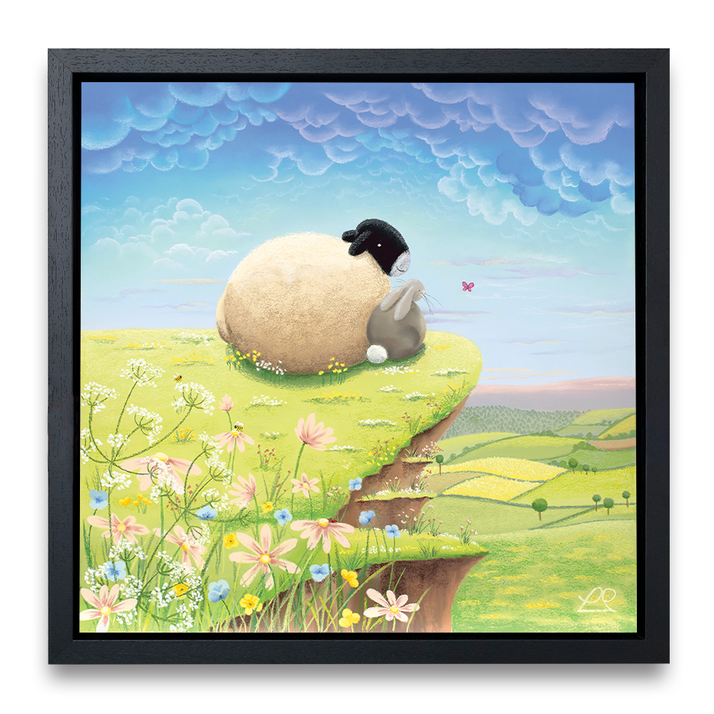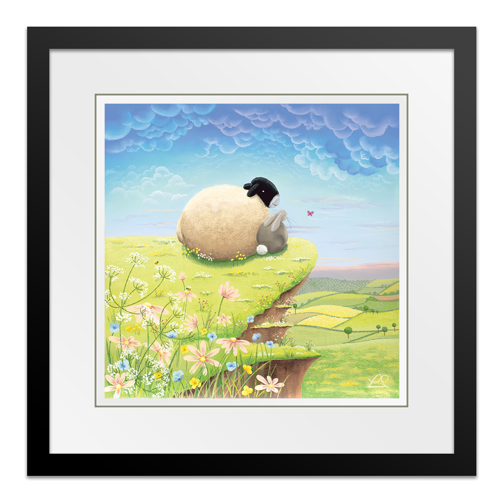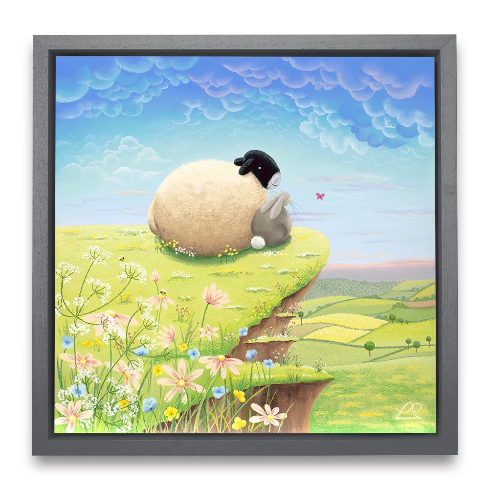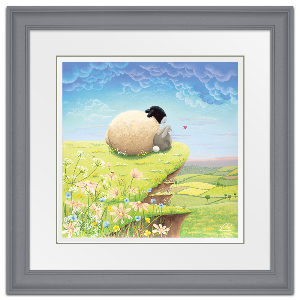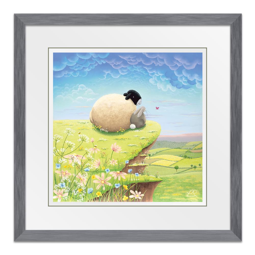 A play on words, these two pals are living 'The High Life' on top of the world, looking down at the beautiful countryside. You can imagine all sorts of conversations about life, taking place between the sheep and the rabbit in this light-hearted piece, perfect for a child's bedroom.