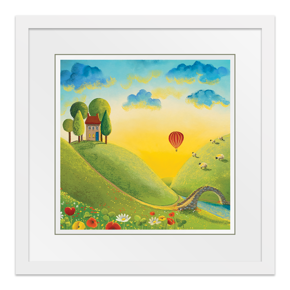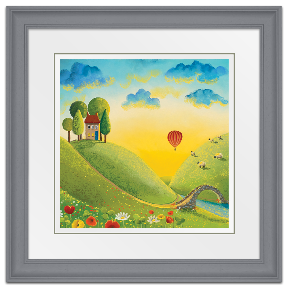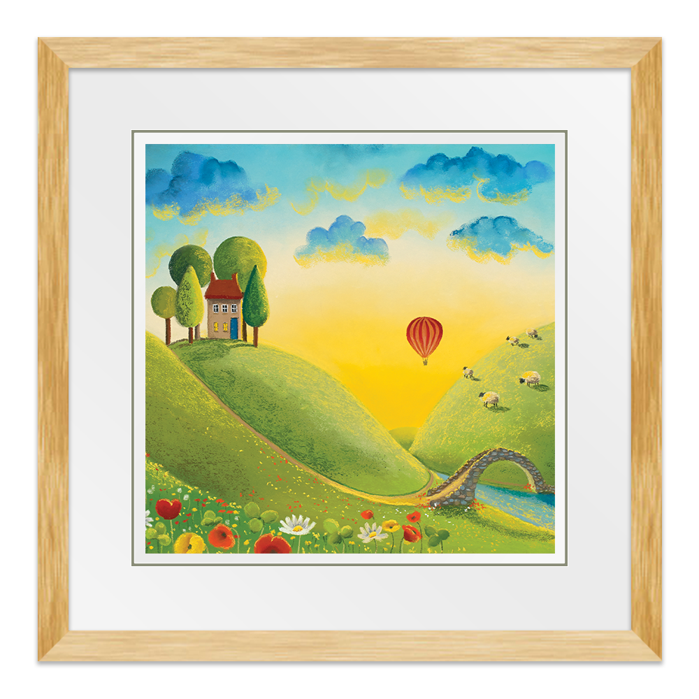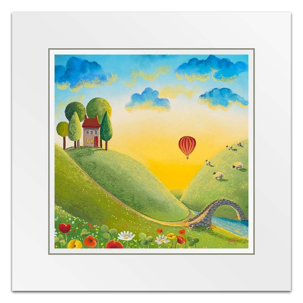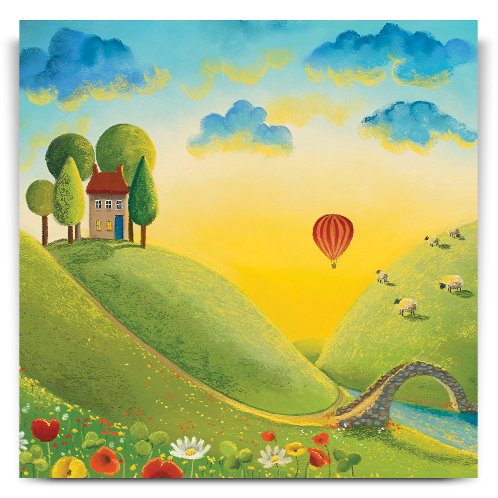 It's a beautiful sunrise and the perfect light to take a journey in a hot air balloon across the stunning landscape. Almost everyone is still asleep but those enjoying their little adventure through the clouds and the woolly spectators! Adapted from the original called Life on the Hill Tops.