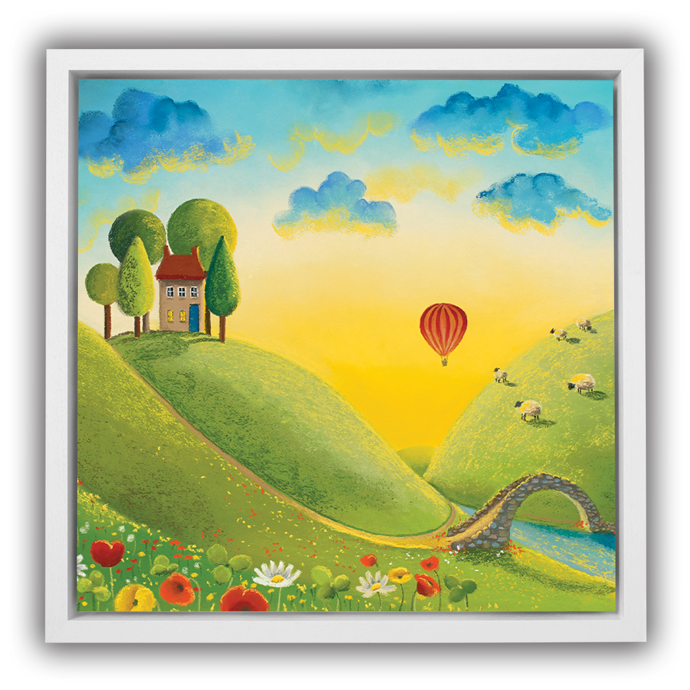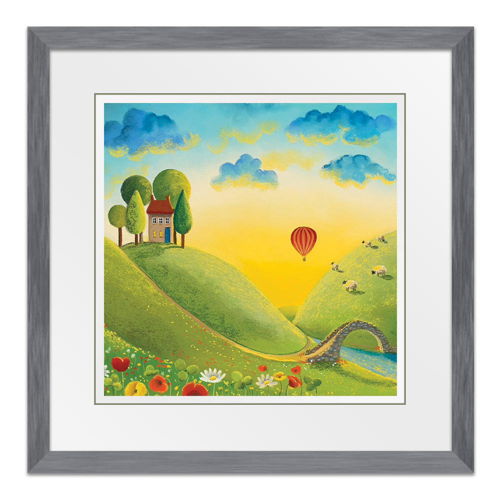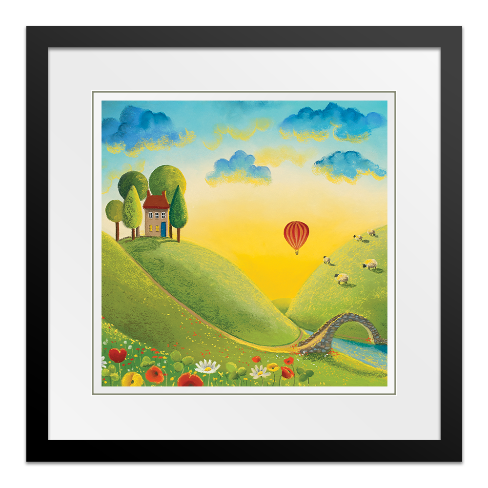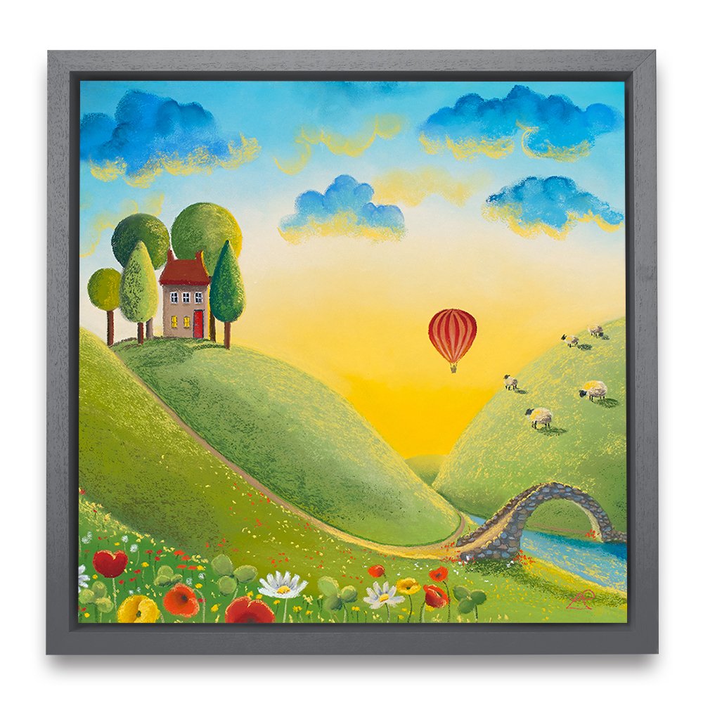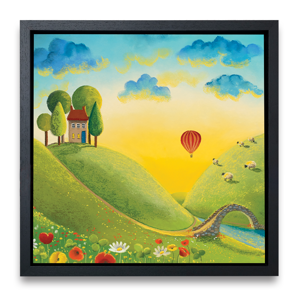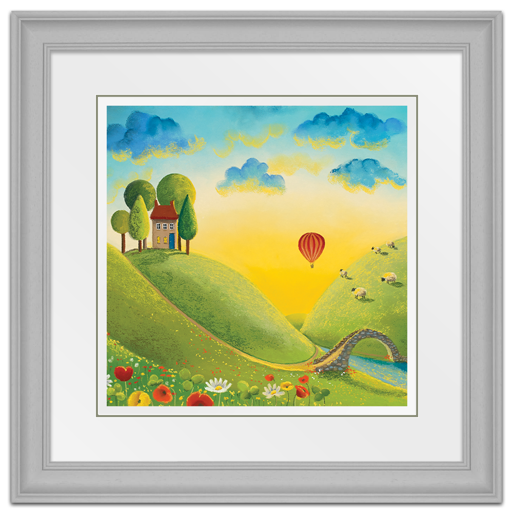It's a beautiful sunrise and the perfect light to take a journey in a hot air balloon across the stunning landscape. Almost everyone is still asleep but those enjoying their little adventure through the clouds and the woolly spectators! Adapted from the original called Life on the Hill Tops.