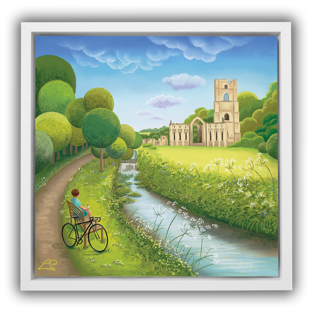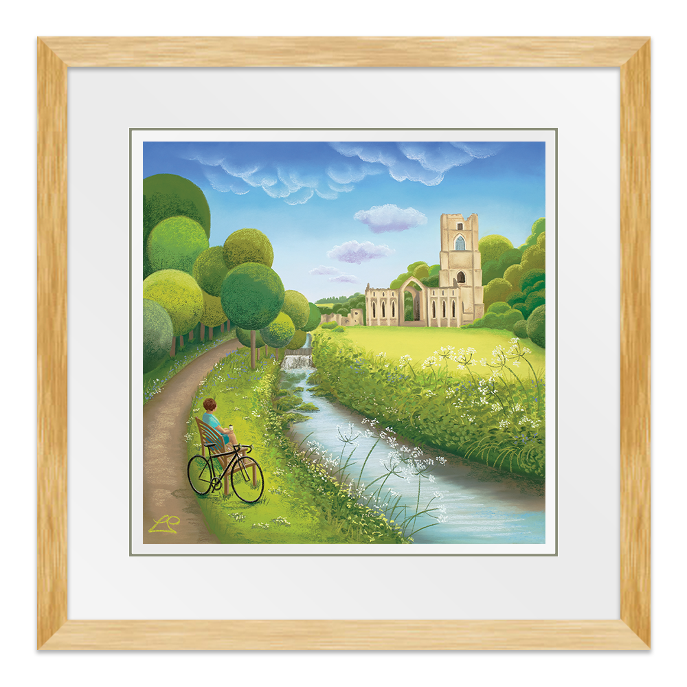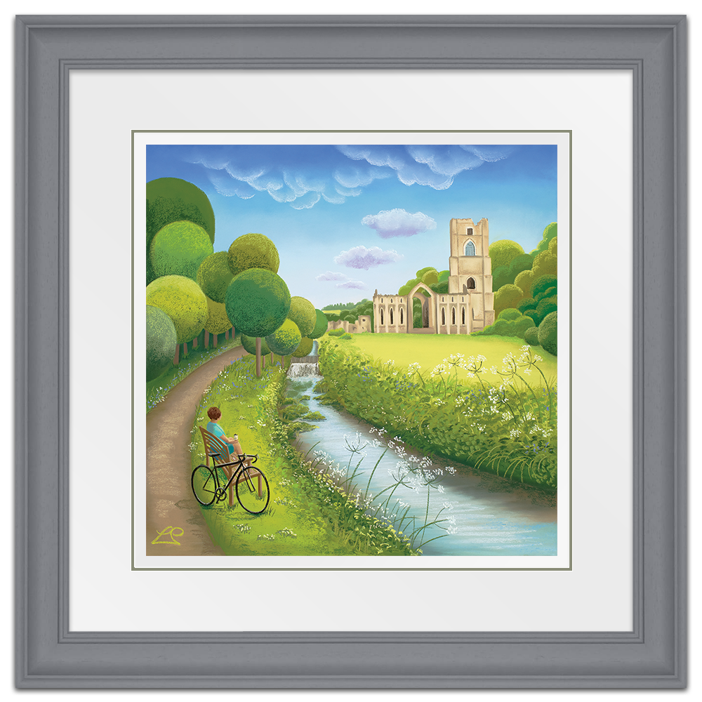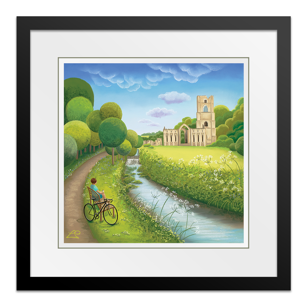 Taking a break alongside the river, overlooking Fountain's Abbey, this cyclist appreciates the stunning scenery in front of them. A deep blue sky and rich green grasses and trees represent a beautiful summer's day. The wild flowers soften the scene and and you can imagine feeling a million miles away, alone with your thoughts.