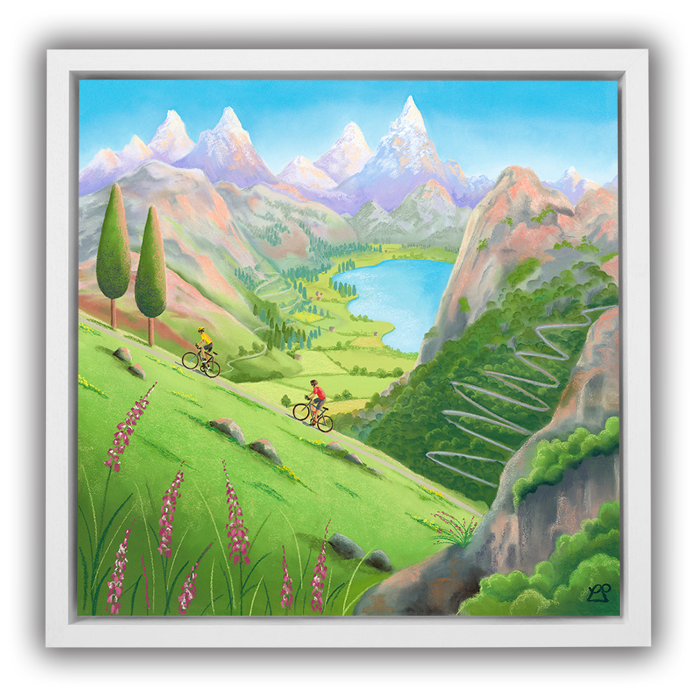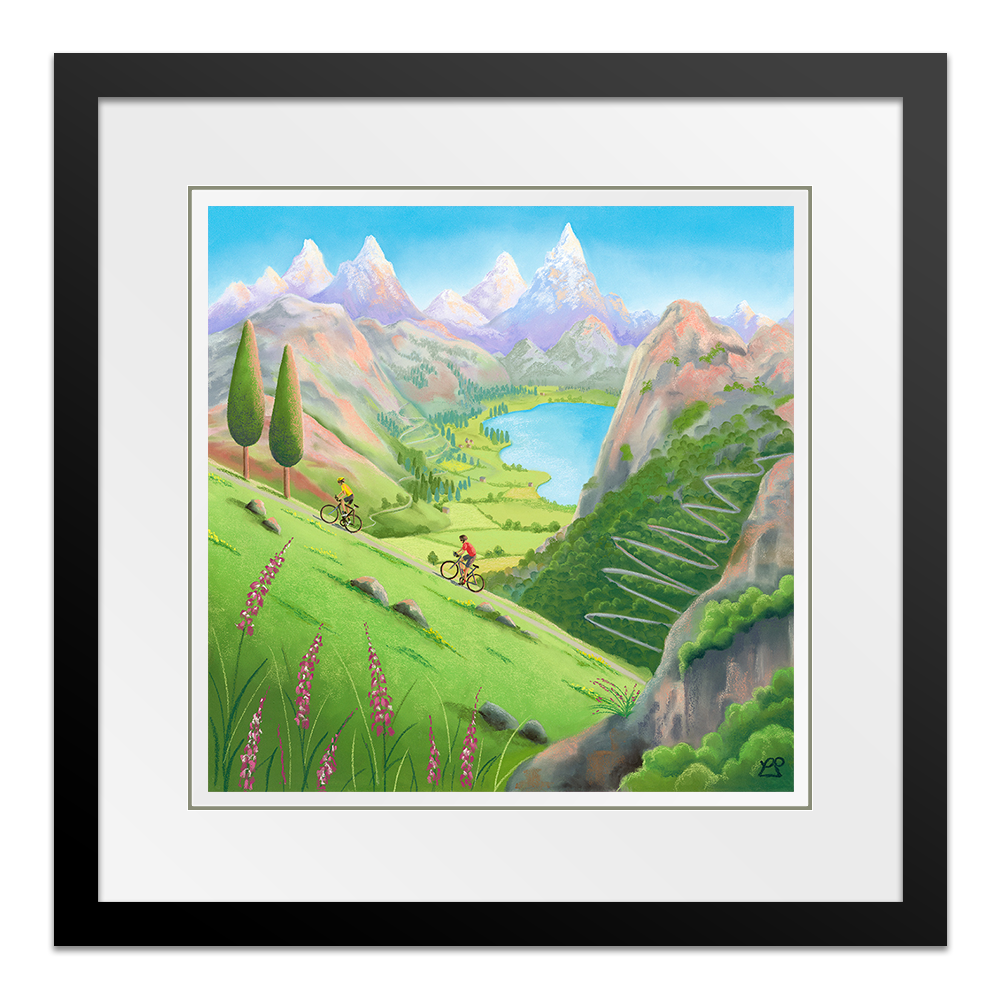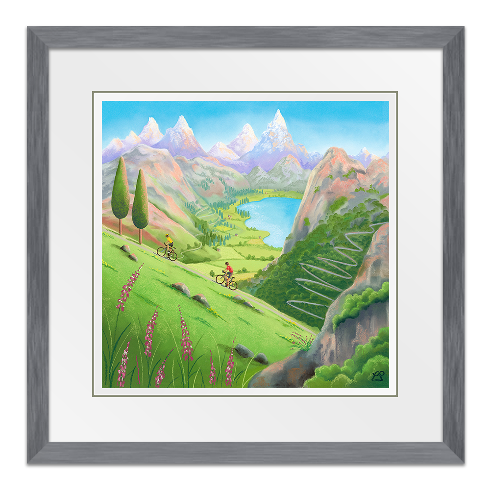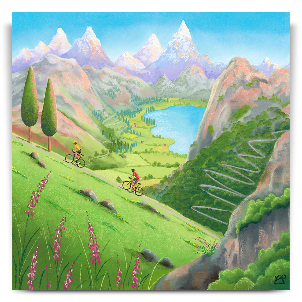 Alpine Adventures captures the exhilaration of cycling through high mountain terrain, inspired by Lucy Pittaway’s family trip to the French Alps to watch the Tour de France. In the distance, the towering peak of Mont Blanc rises above a dramatic skyline, while a winding ascent reminiscent of the iconic Alpe d’Huez exists in the background. The two riders ascend a steep hill, in the foreground with a glistening lake and peaceful valley below, the scene celebrates the beauty, scale and spirit of cycling in one of the sport’s most legendary landscapes.