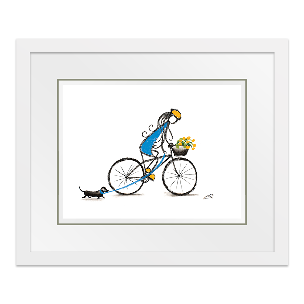 The healing colours of blue and yellow offer a bright injection of colour to this cheery print of a girl walking her pet sausage dog.