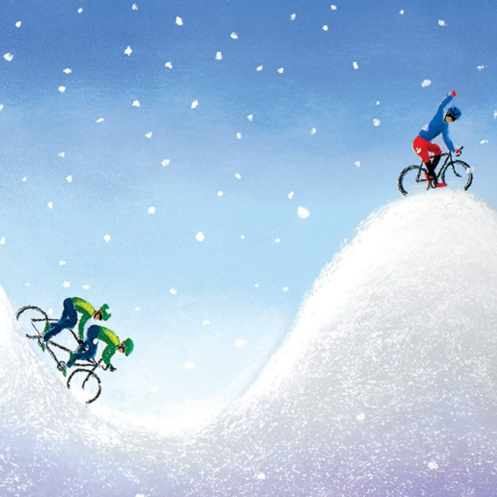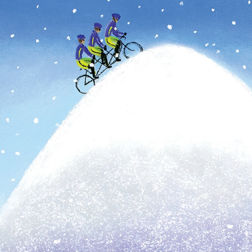 A fun and quirky winter scene cycling print by renowned Tour de Yorkshire cycling artist Lucy Pittaway.