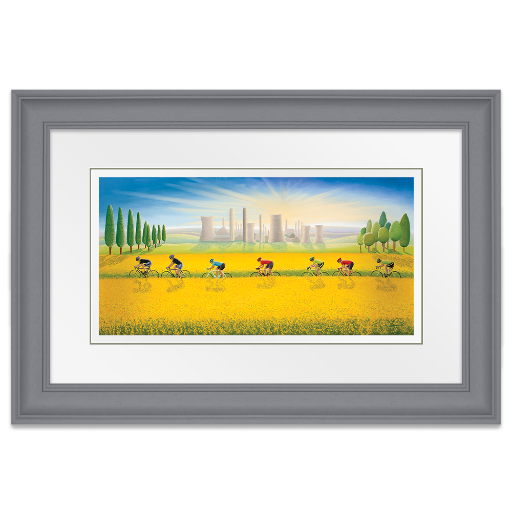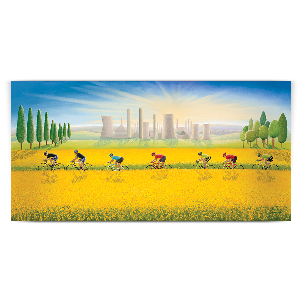 Created as part of the 2017 Tour de Yorkshire cycling collection, Fields Of Gold shows cyclists riding through the colourful golden fields of oil seed rape. In stark contrast to the colourful riders and their countryside, sits the tall grey structures of modern industry, creating a real contrast in the piece.