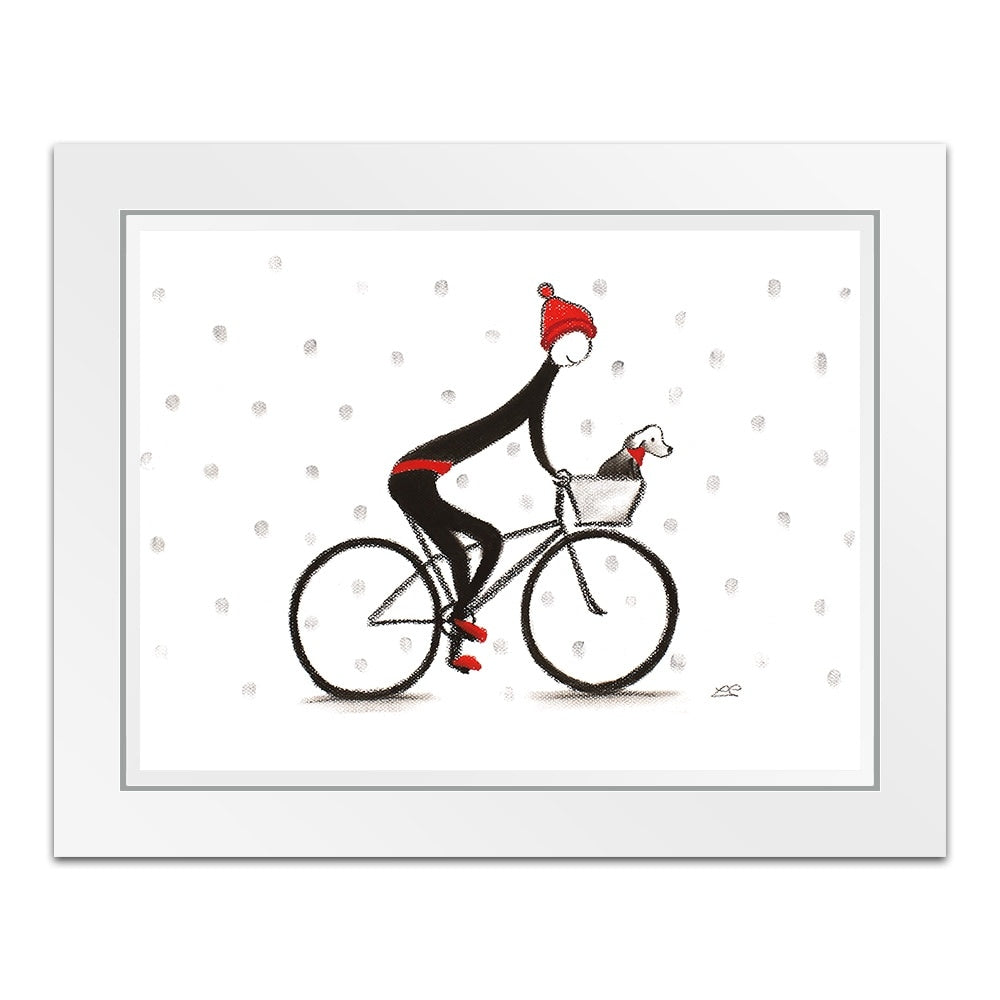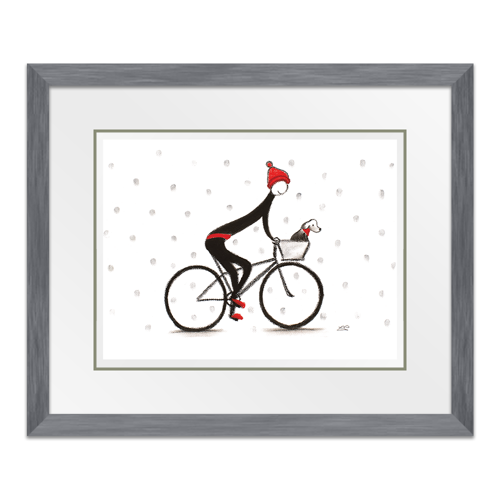 This artwork features a cyclist enjoying a bike ride with her pet dog.
