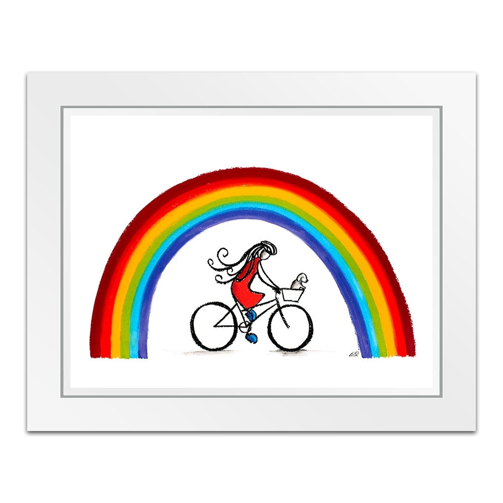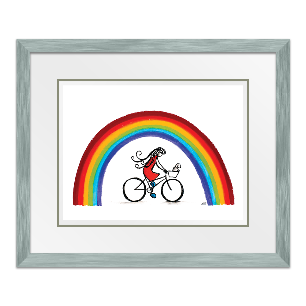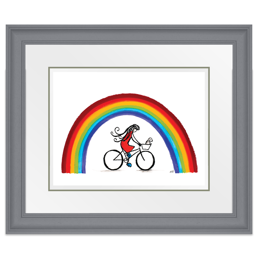 With your best pal in the front seat, imagine the feeling if you could ride through a bright and colourful rainbow, and be transported to a safer, better world. This colourful artwork features a female cyclist riding along with a dog in her basket.