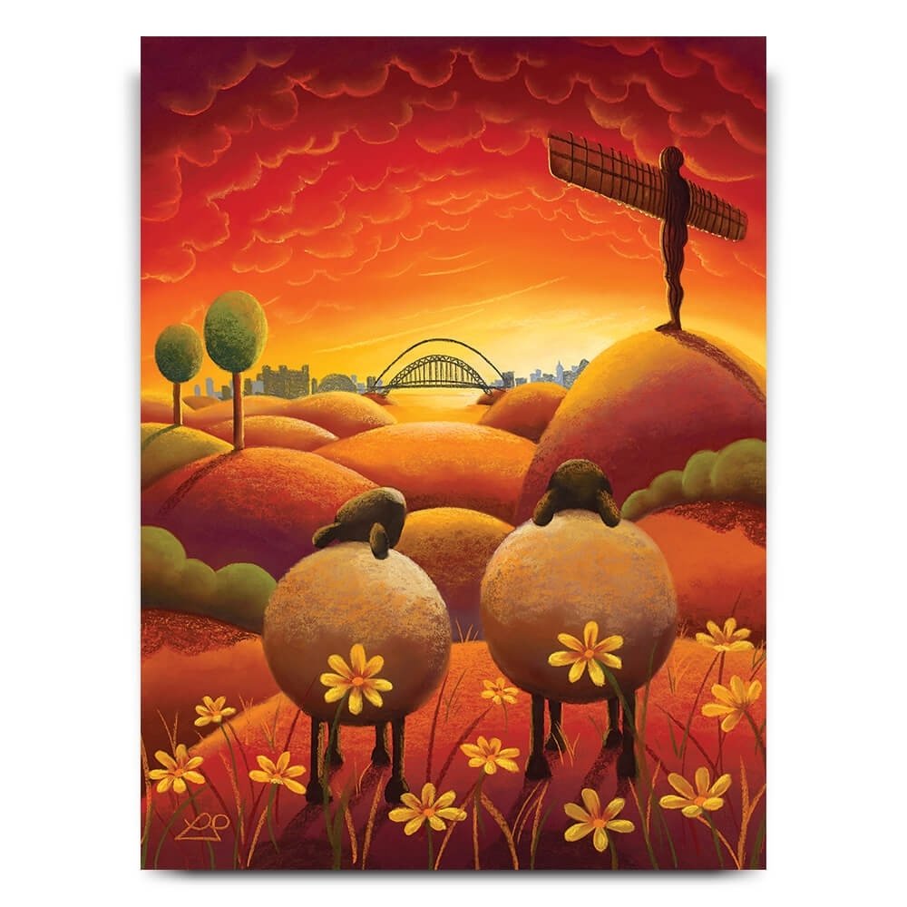 Bathed in light from the intensity of the sun, the rusty red colours of the Angel of the North come alive. The surrounding landscape looks ablaze with rich red light falling upon it. In the distance you can see Newcastle with its famous Tyne Bridge and the Millennium bridge and two familiar characters from my world stand proudly in the foreground taking it all in.