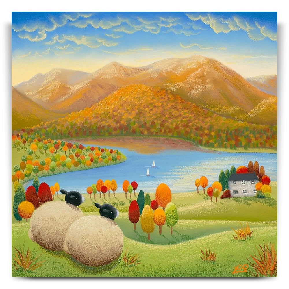 Lake District inspired artwork with two Swaledale sheep overlooking a small boat on the lake set against an autumnal scene and a lovely white house on the lake
