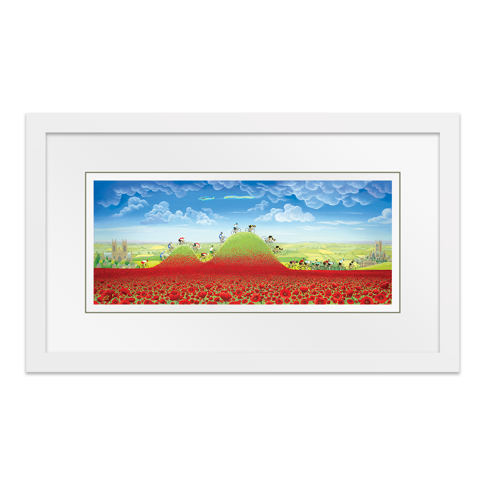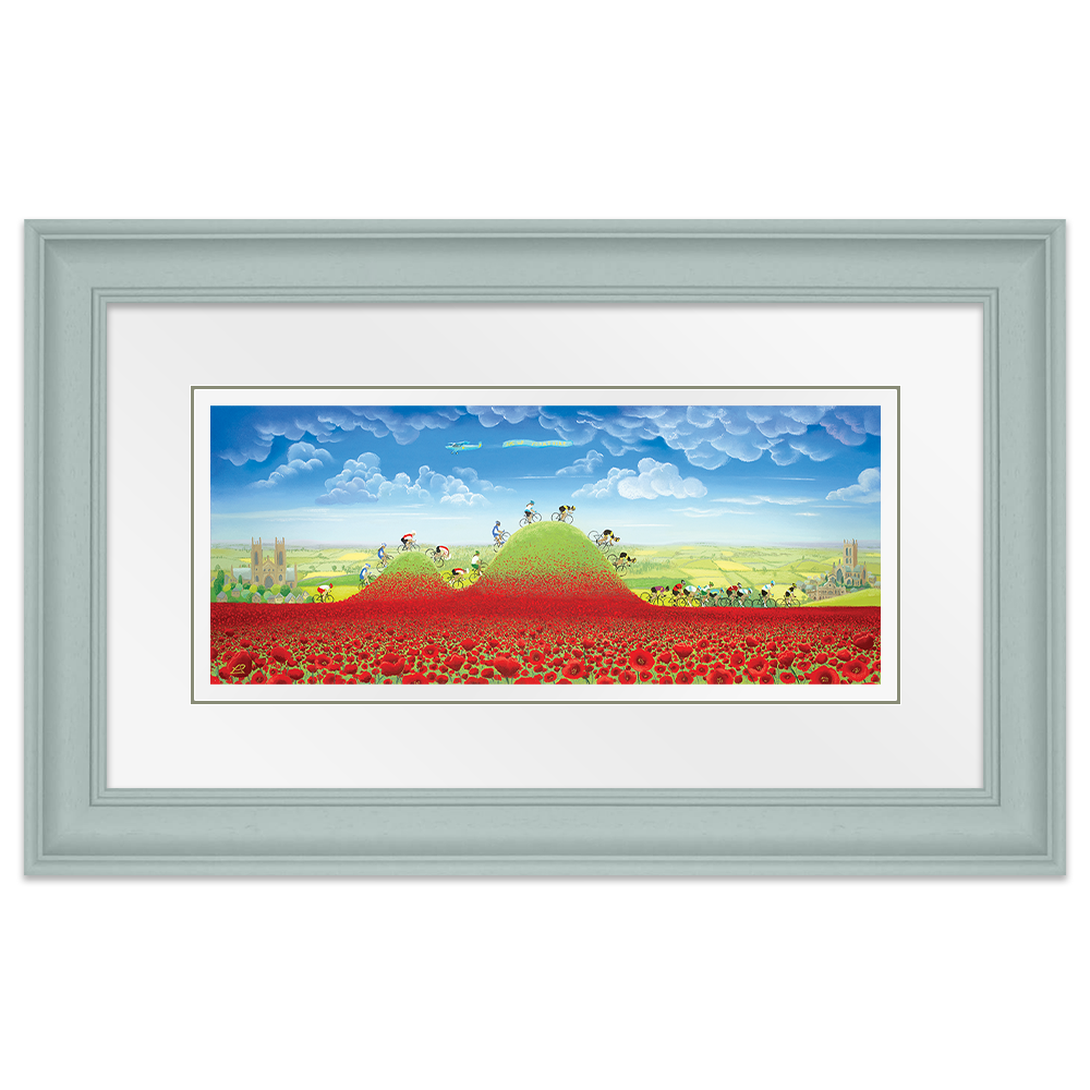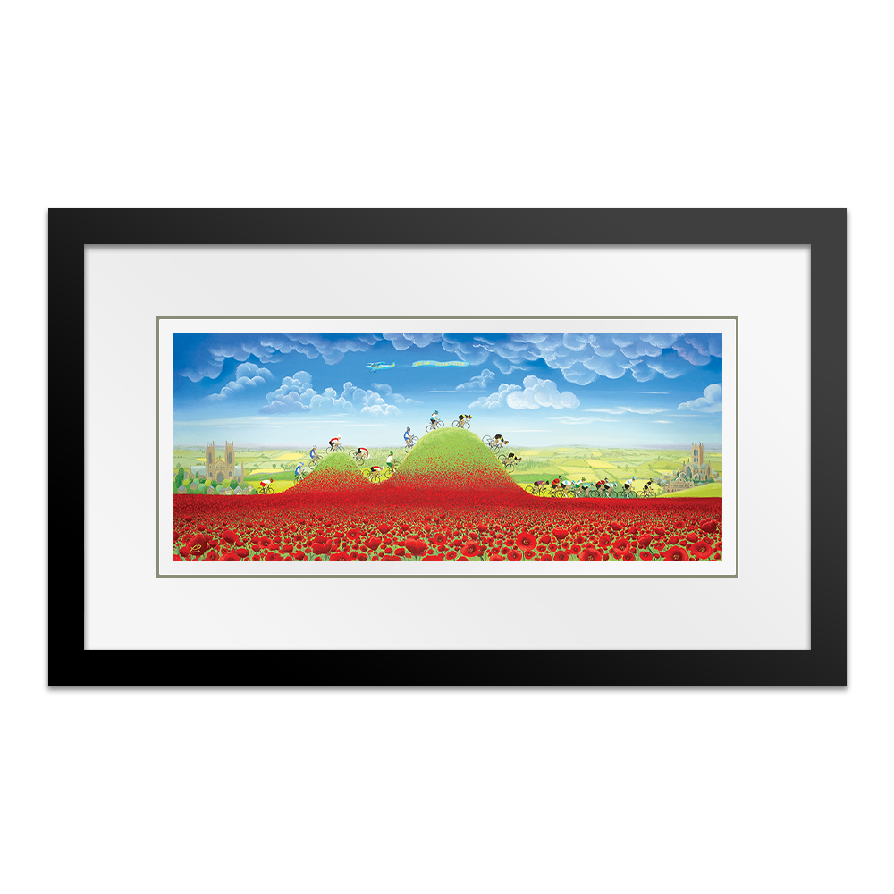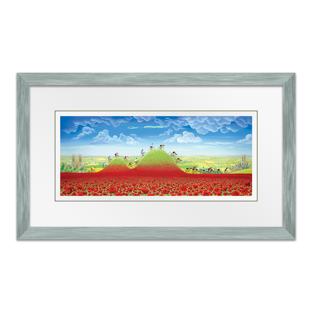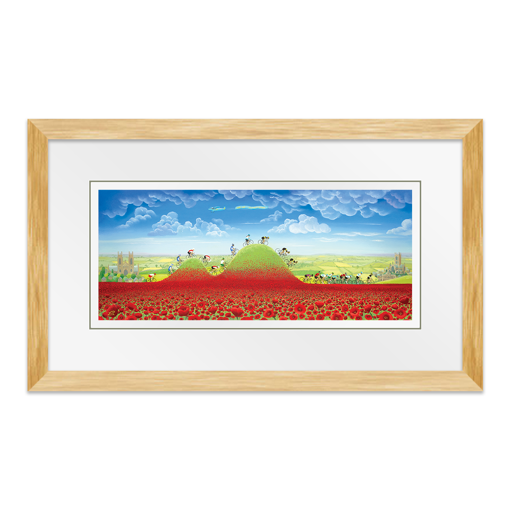 Beverly and Doncaster ministers are dominant features in the landscape, highlighting the starts and finish points. Also included is the market hall in Doncaster. The poppies are not only representative of the time of year and the beautiful colours of the Yorkshire landscape but there’s a tentative link to the ceramicist Paul Cummings who created all the poppies for the scene at the Tower Of London memorial. It was to bring something into the painting that helped blend with the title ‘Arts and Culture’! There’s also a plane banner with a message Aye Up Yorkshire in the TDY colours for a bit of fun!