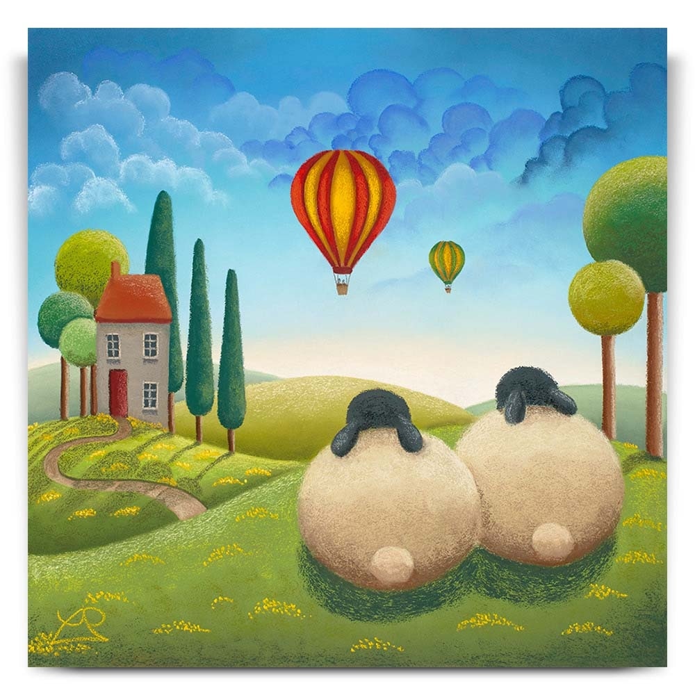 It's a perfect summer's day and these two sheep are entertaining themselves watching the hot air balloons floating away in the distance imagining what it must be like to be high flyers.