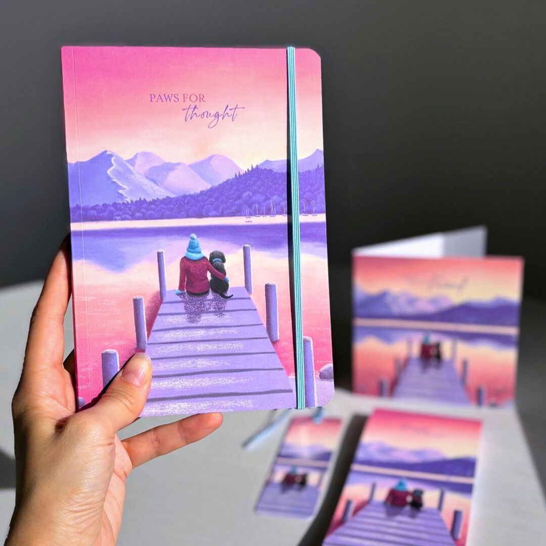 Introducing Lucy's A Pawfect Place by the Water artwork, elegantly featured in this exquisite perfect-bound notebook. Ideal for capturing your thoughts, plans, and projects.