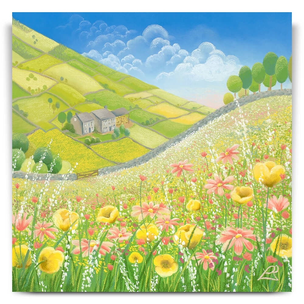 Beyond the meadow filled with beautiful wild flowers in soft pastel shades, sits a quaint farm, nestled in the valley of the Dales. This is a perfect summer scene, transporting you to a beautiful space, where you can imagine walking amongst the scents and sounds of the English Countryside.