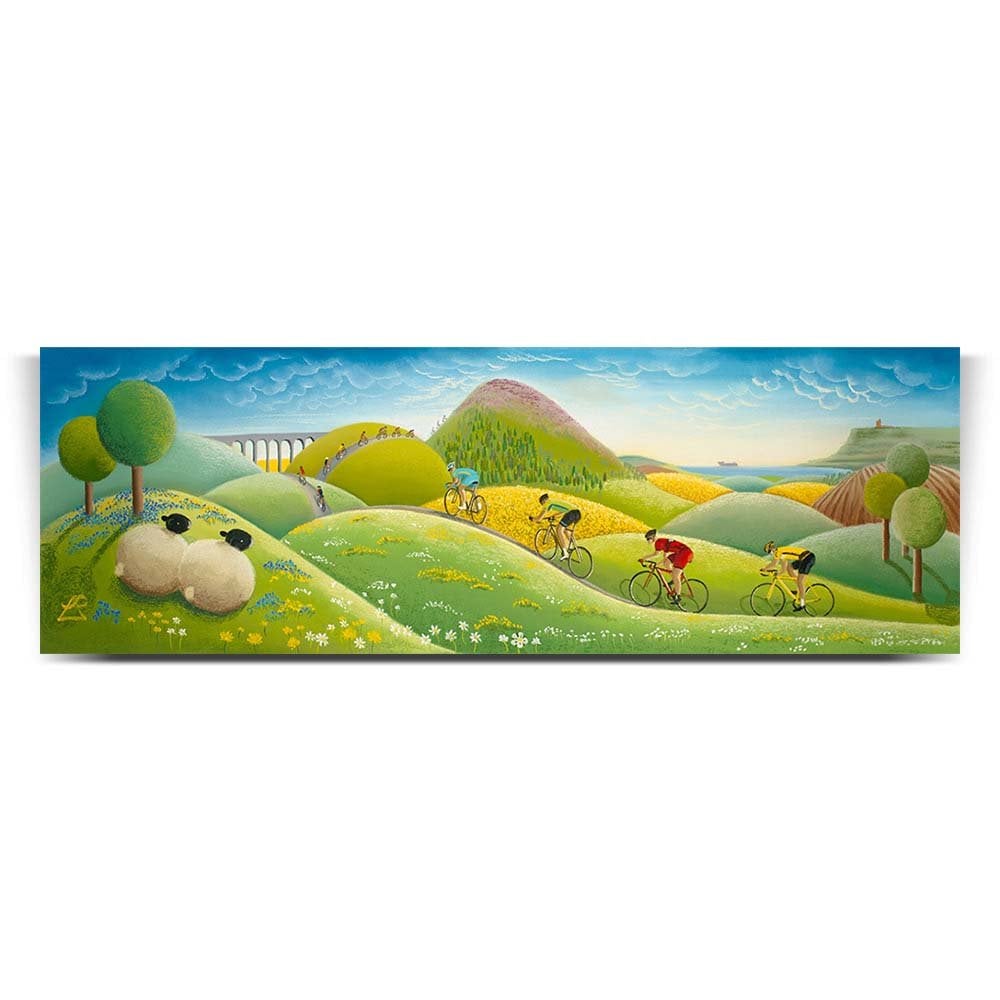 One of my Tour de Yorkshire inspired paintings for the 2016 collection. Epic Ride is a colourful interpretation of the rolling hills and peaks encountered along the route to the coastline. The riders can be seen as far as the highest peak as they follow the lines of the landscape. Lucy