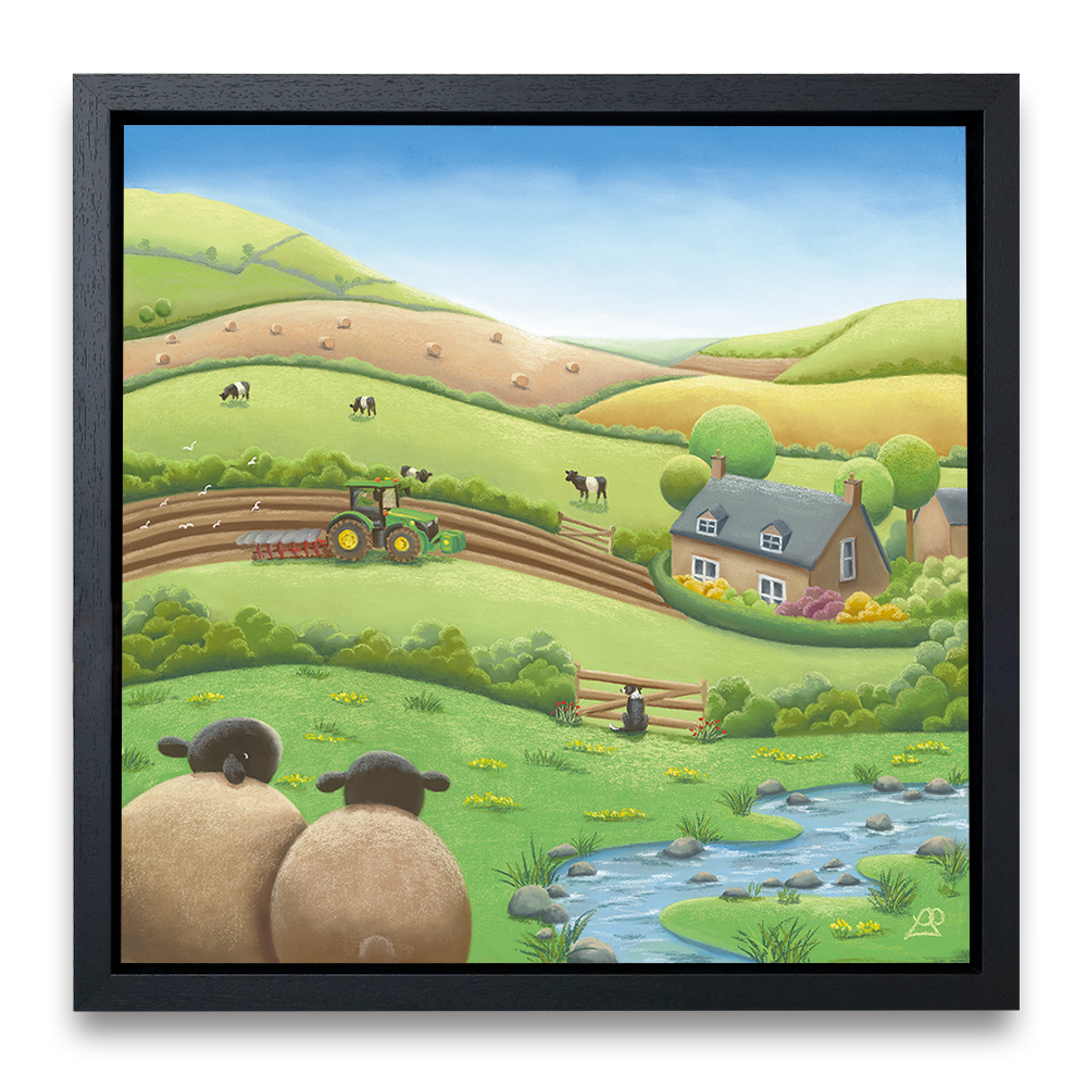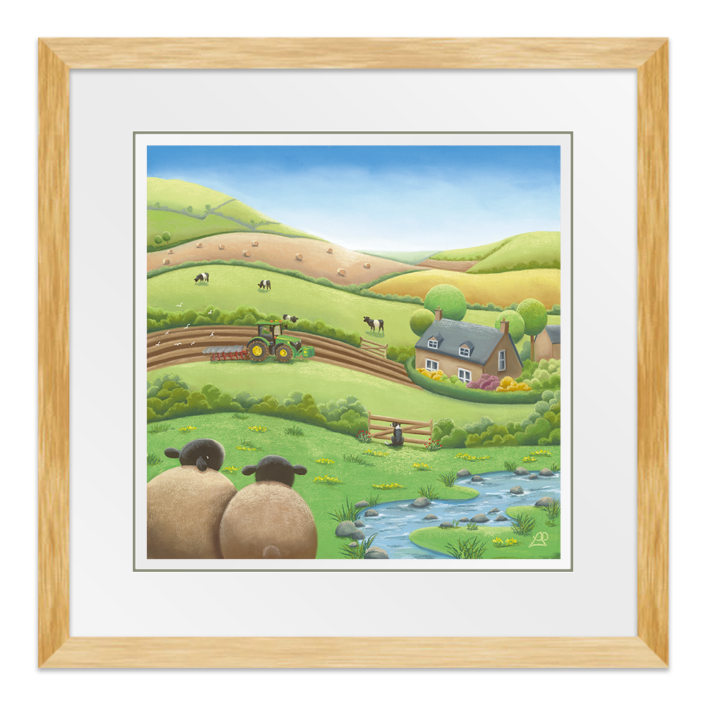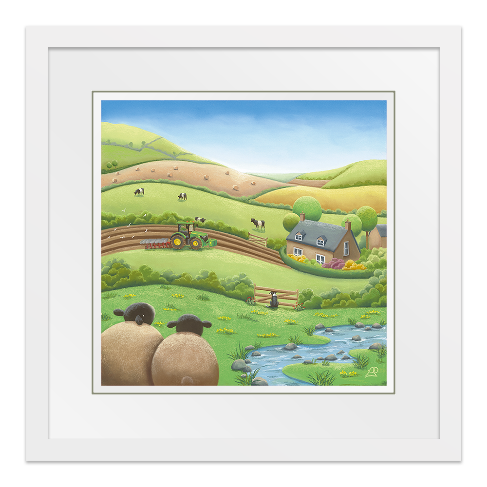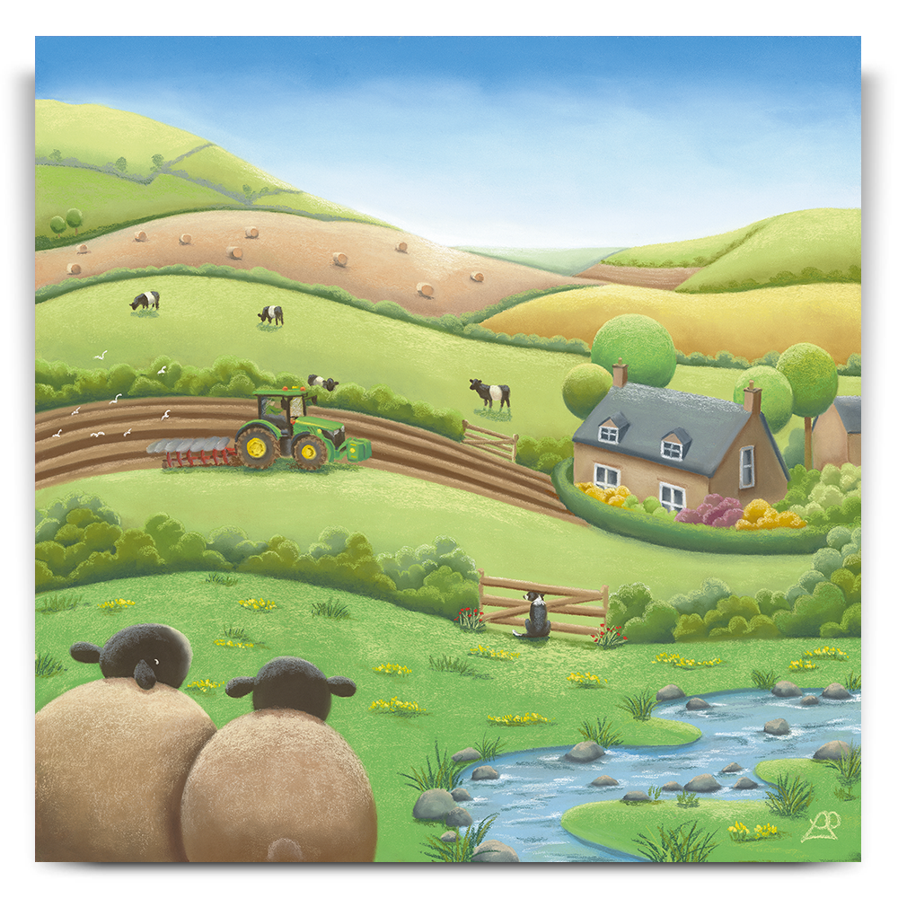 Busy working the land on their beautiful farm, this farmer is unaware they have an audience watching. A Belted Galloway cow pokes his head over the hedge, as the farm Collie Dog watches through the fence opposite, and two sheep sit in back, taking it all in, keeping a safe distance. Maybe you could say something about the beauty of the surrounding fields like a patchwork quilt.