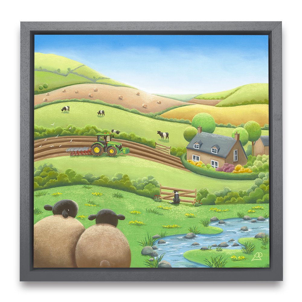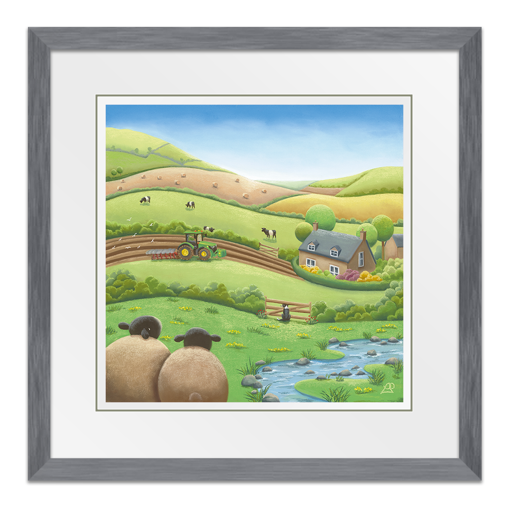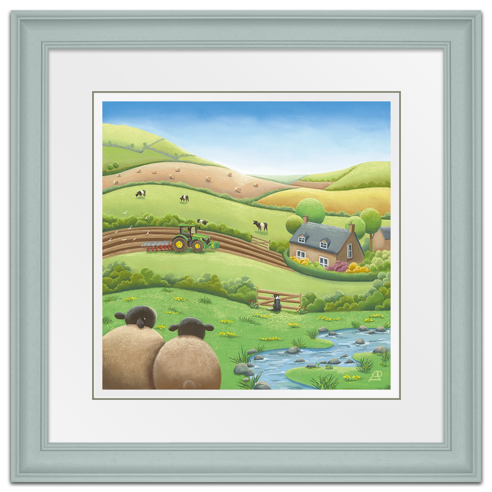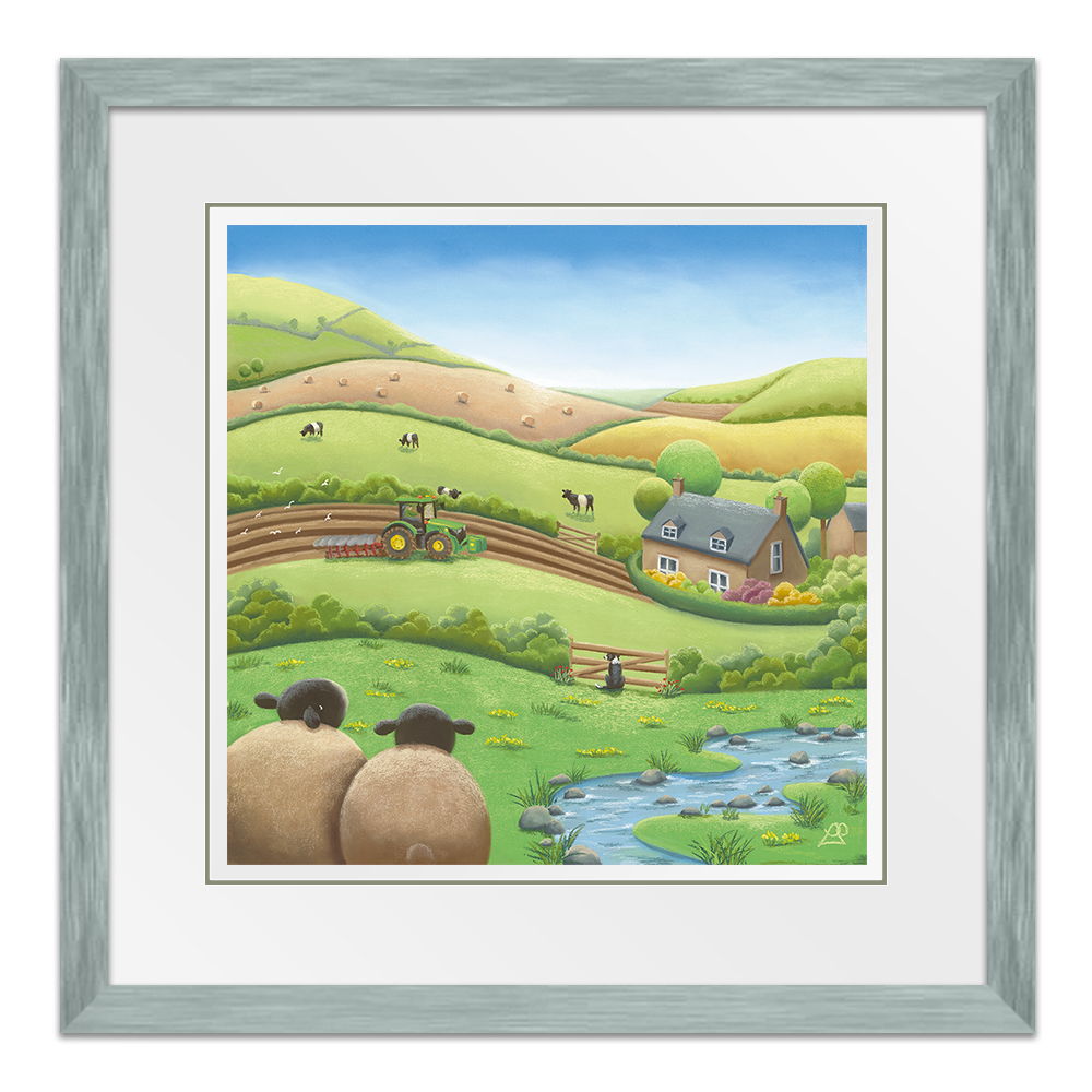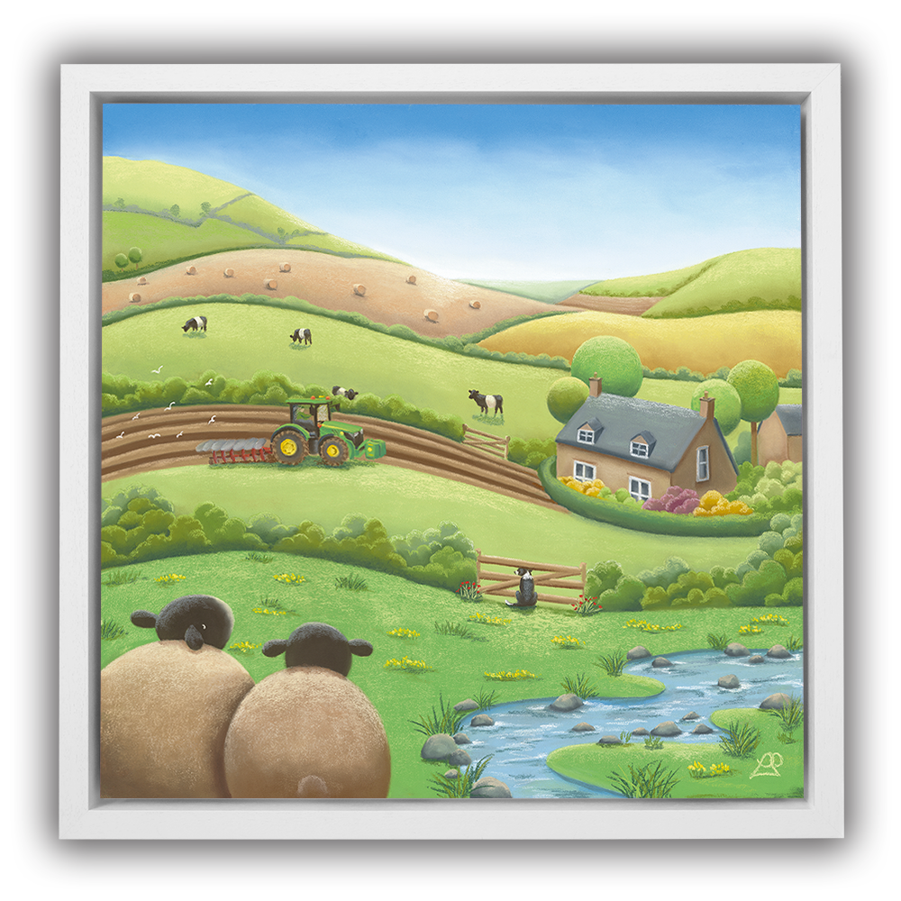 Busy working the land on their beautiful farm, this farmer is unaware they have an audience watching. A Belted Galloway cow pokes his head over the hedge, as the farm Collie Dog watches through the fence opposite, and two sheep sit in back, taking it all in, keeping a safe distance. Maybe you could say something about the beauty of the surrounding fields like a patchwork quilt.
