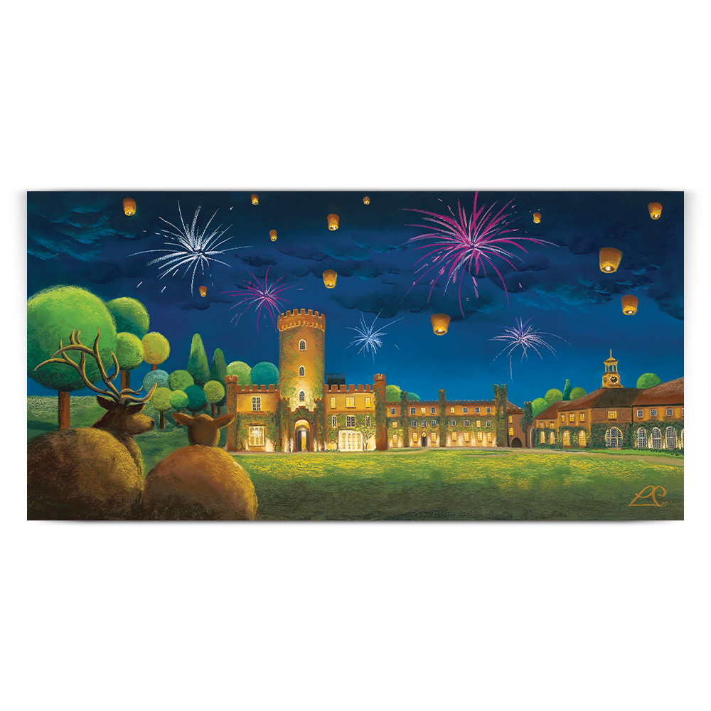 Painted with a close family member in mind, Swinton Celebrations was named so because it was their wedding venue. A stunning location brought to life with night time illuminations showcasing the turret against the backdrop of the celebratory lanterns and fireworks. The deer and stag look on, now united under the star lit sky.