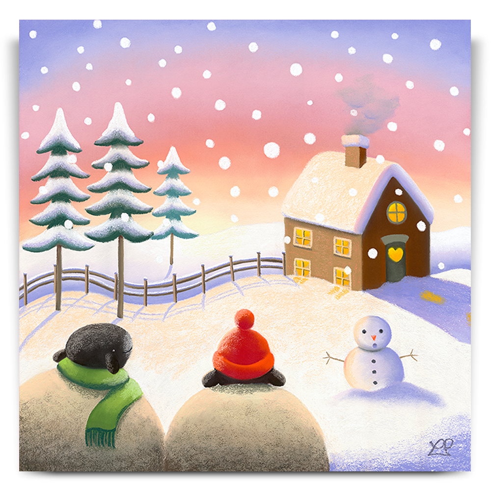 As the sun dips below the horizon, casting a warm, golden glow over the snowy landscape, a charming scene unfolds. A hapless snowman finds himself without his winter clothing, his cosy woollens seemingly 'borrowed' by two mischievous sheep who are already well-equipped with their fleecy coats.