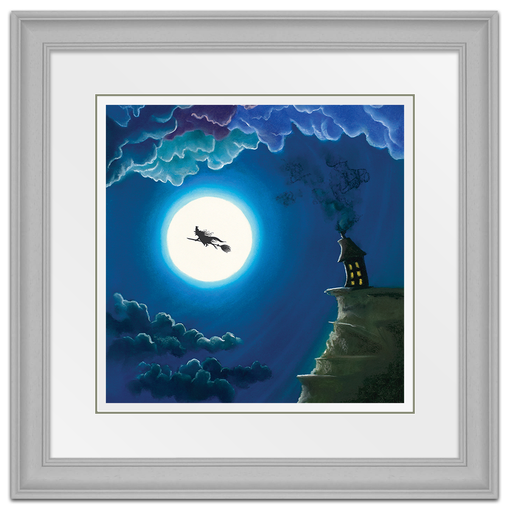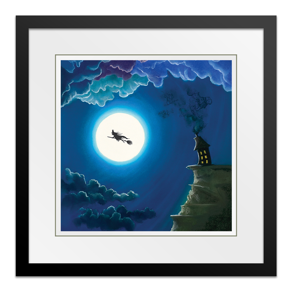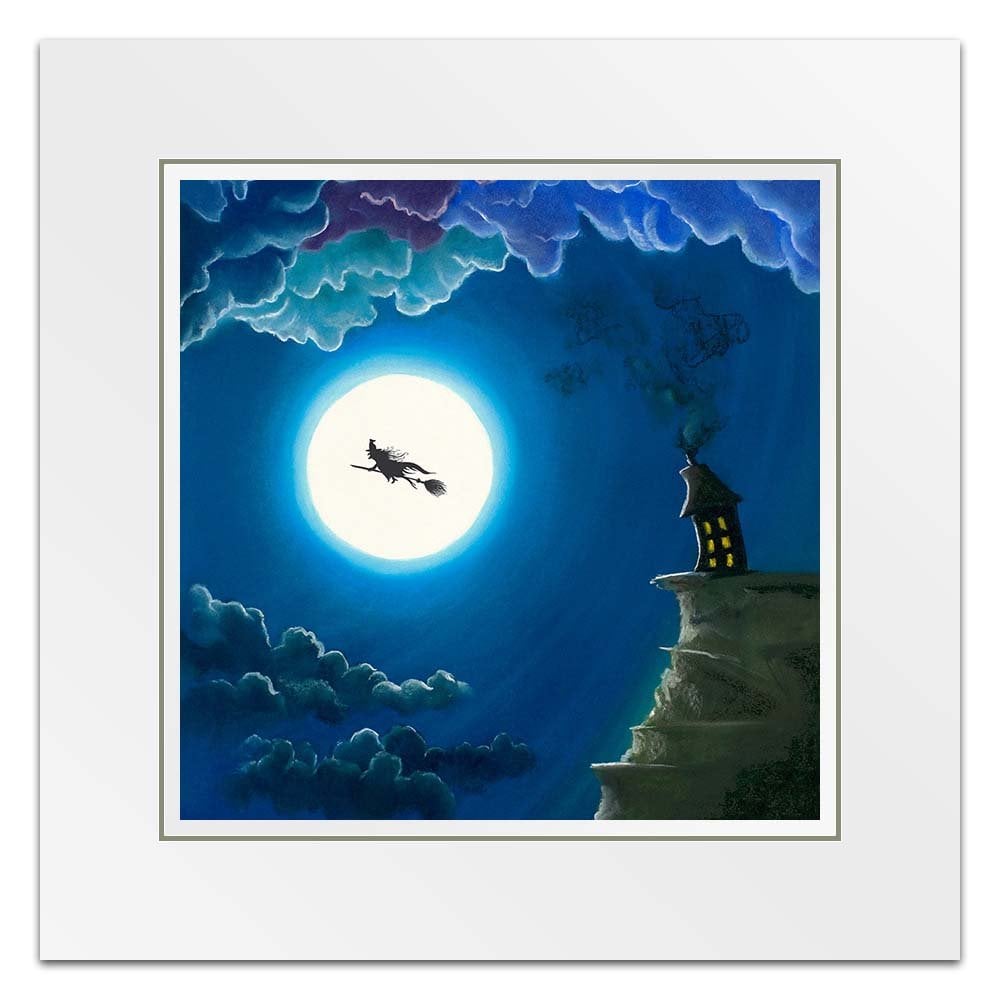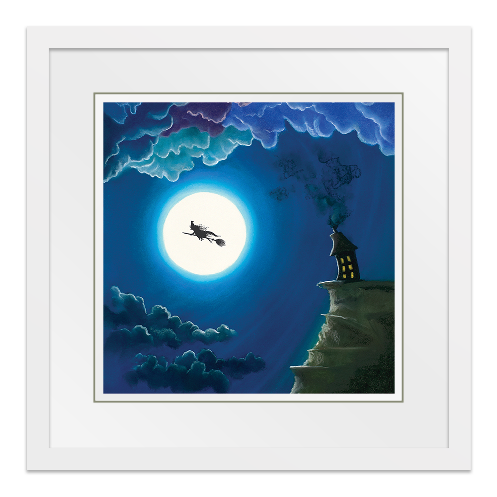 'Off To Work' is a special Halloween inspired artist print with a quirky witch on her broomstick flying across the moon off on her rounds for the day!