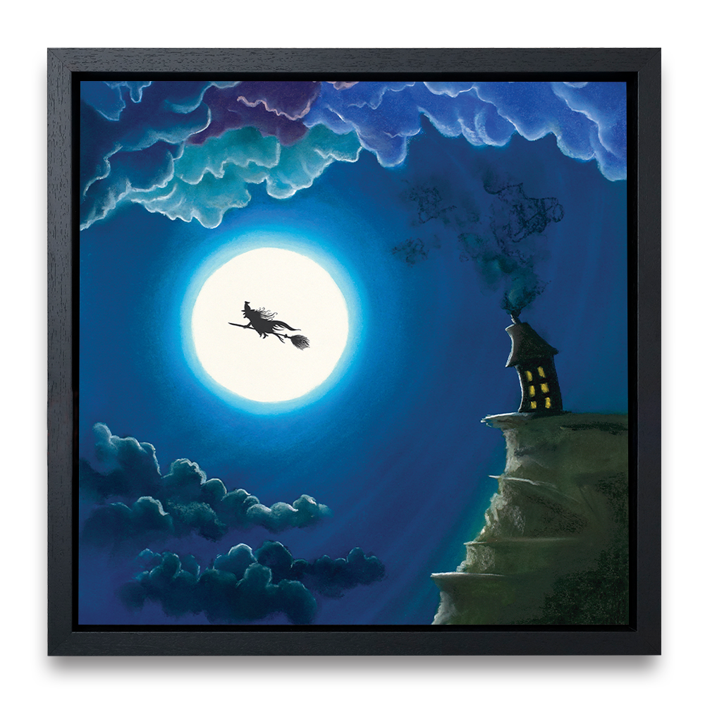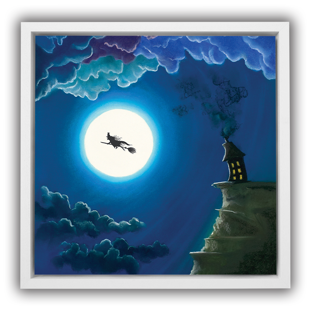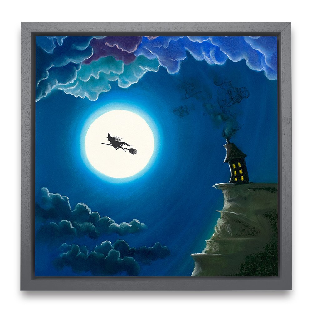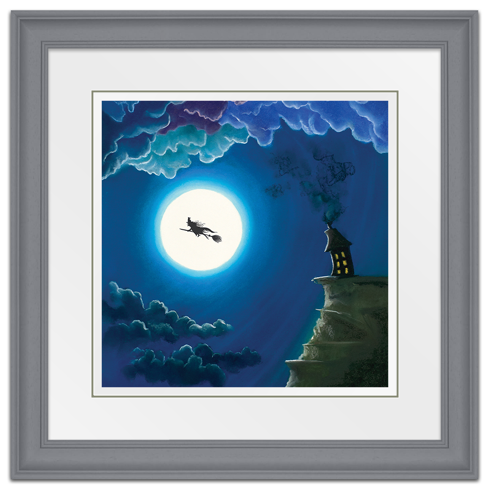 'Off To Work' is a special Halloween inspired artist print with a quirky witch on her broomstick flying across the moon off on her rounds for the day!