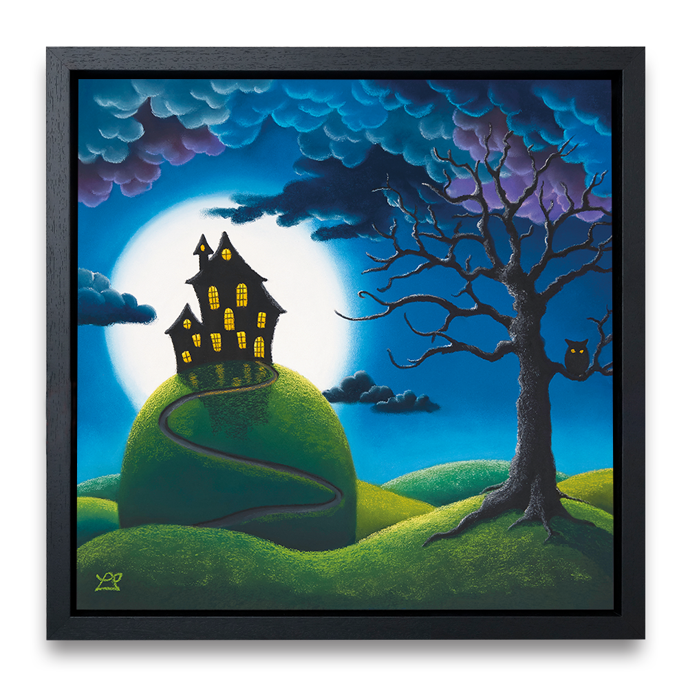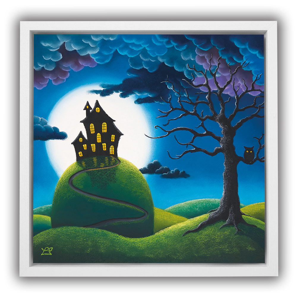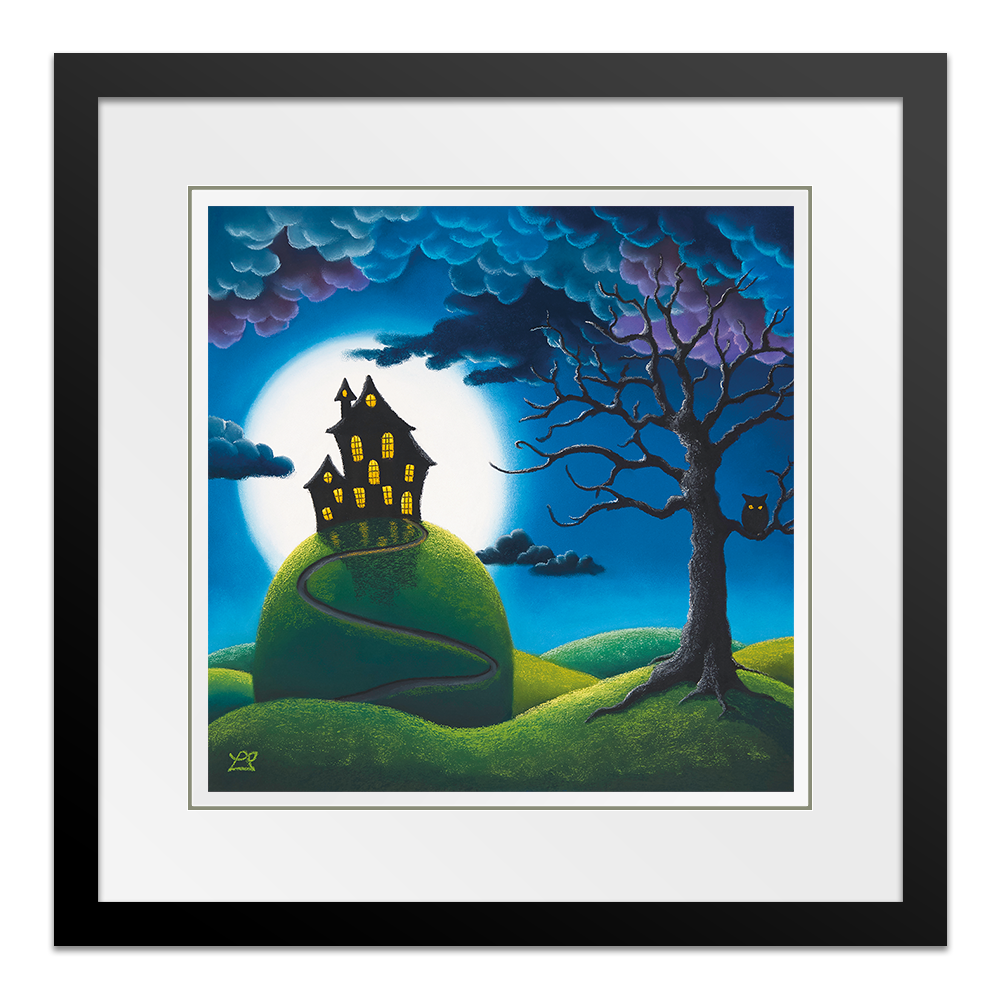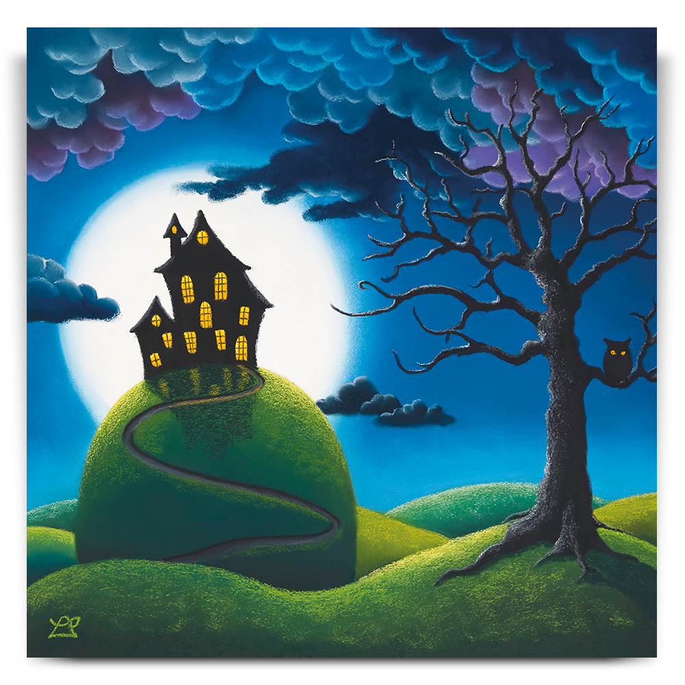 Behind a warmly lit house on top of a tall hill, hangs a huge full moon, surrounded by the encroaching dark curly clouds. Bright wide eyes are watching everything on this mysterious night.