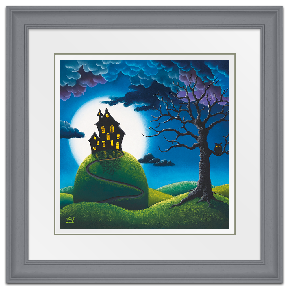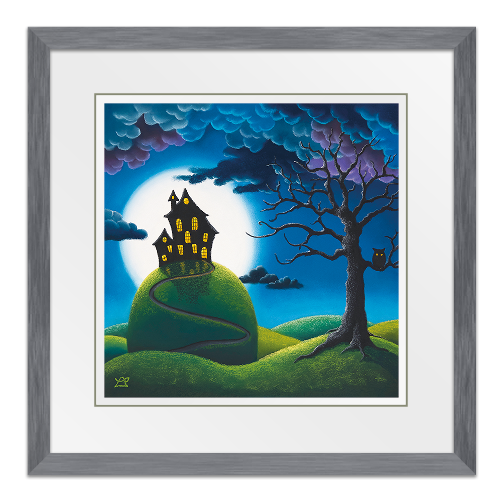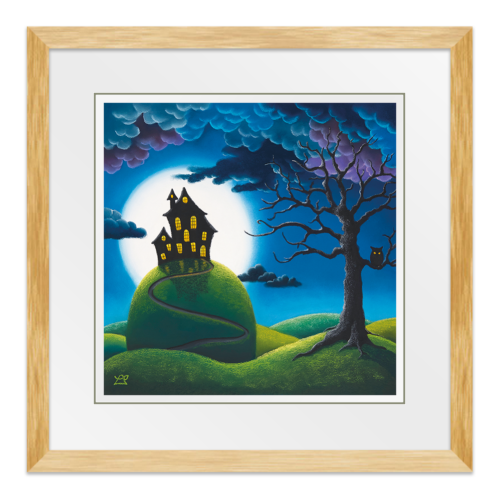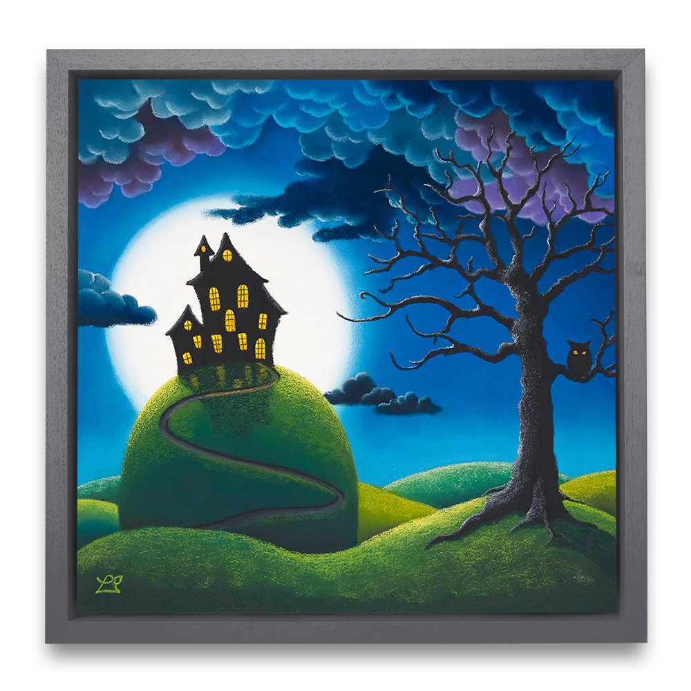 Behind a warmly lit house on top of a tall hill, hangs a huge full moon, surrounded by the encroaching dark curly clouds. Bright wide eyes are watching everything on this mysterious night.