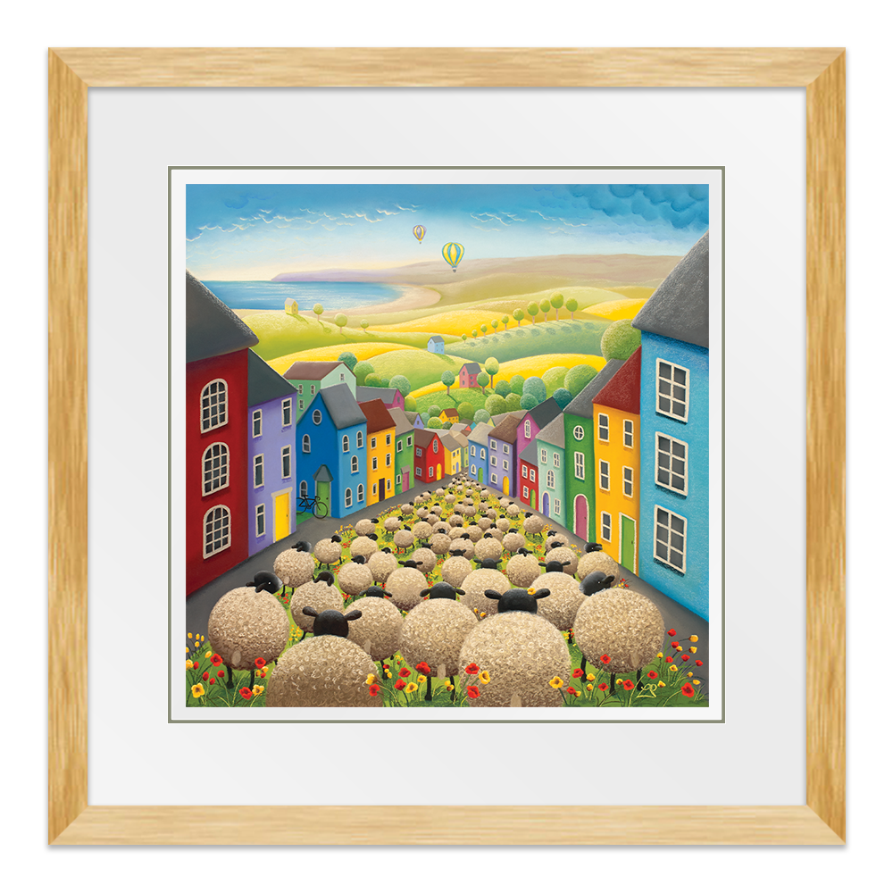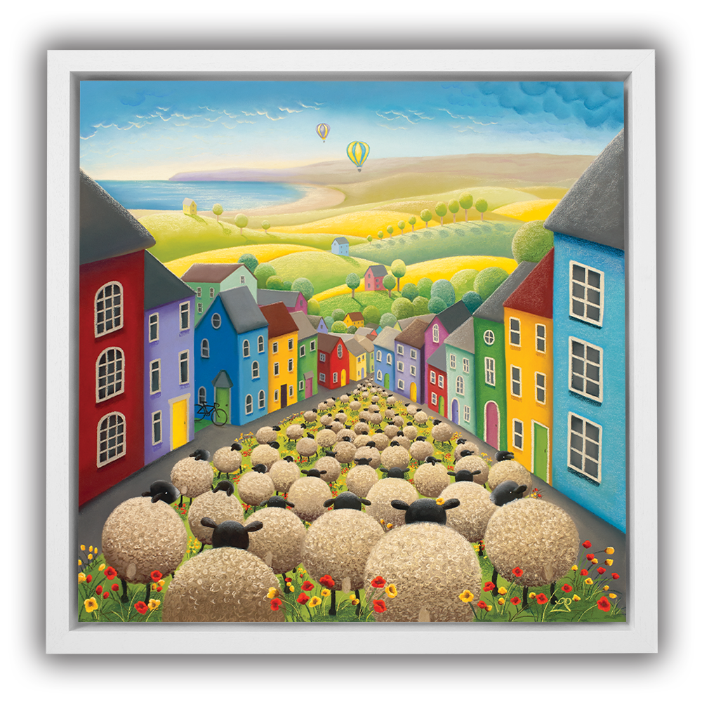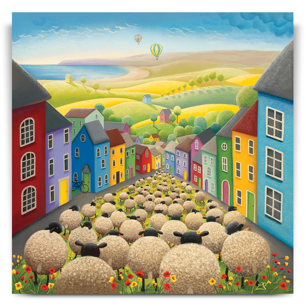 A street full of rainbow-coloured houses and red and yellow poppies, with hot air balloons on the horizon plays host to a crowd of woolly visitors on their way to brighter pastures. A nod to the difficult times brought on by the Covid-19 pandemic in 2020. The painting is full of hope and reminded us that family and friends would be together once again.