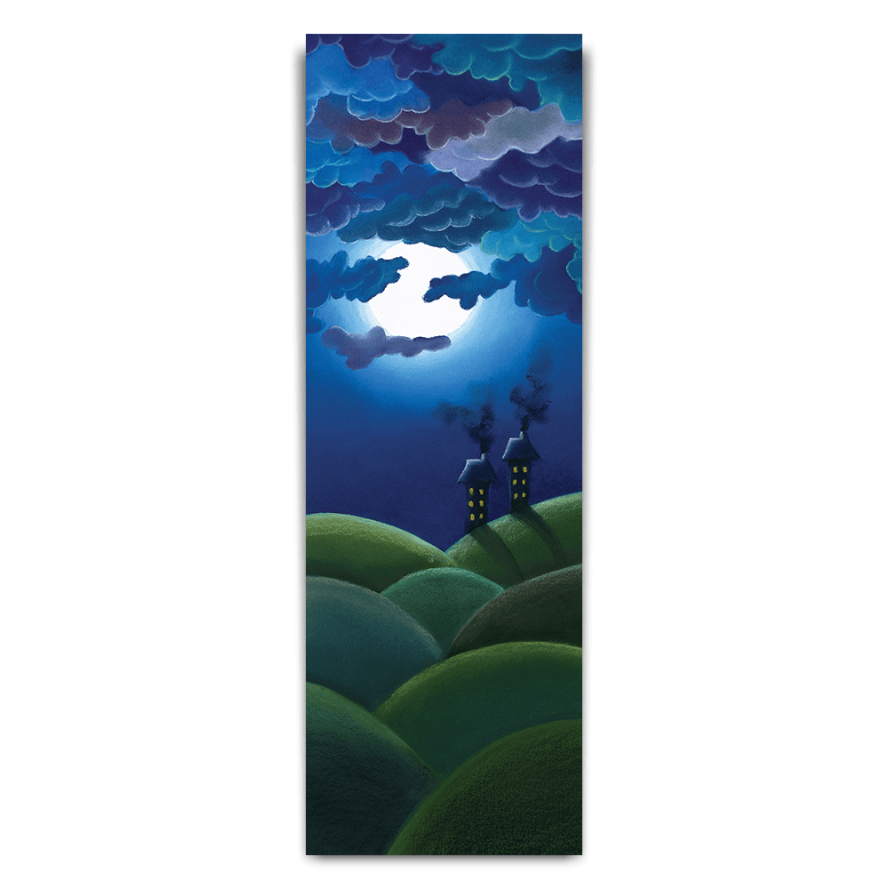 This painting, simple in its approach represents two people, so alike and well matched but not yet together. The moon is large setting the scene of a romantic evening and the houses are placed, full of warmth under its cool soft light.