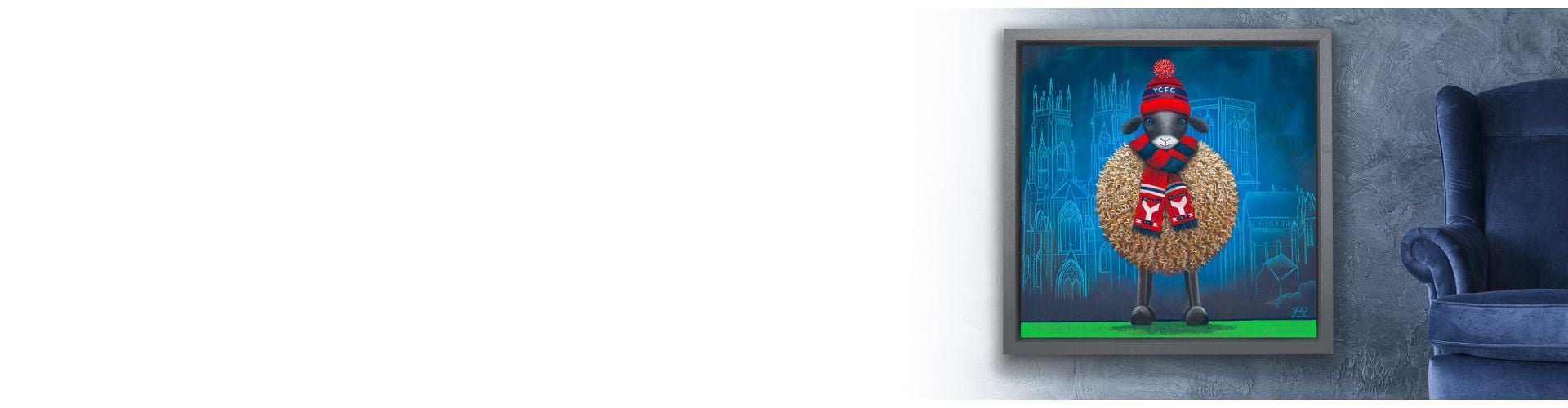 Celebrating York City FC, this proud supporter stands before the city’s famous Minster, dressed head to hoof in red, blue and white. Wrapped up in his YCFC hat and scarf, he’s ready to cheer on The Minstermen whatever the score. A fun nod to York’s loyal fans and their love for the game.