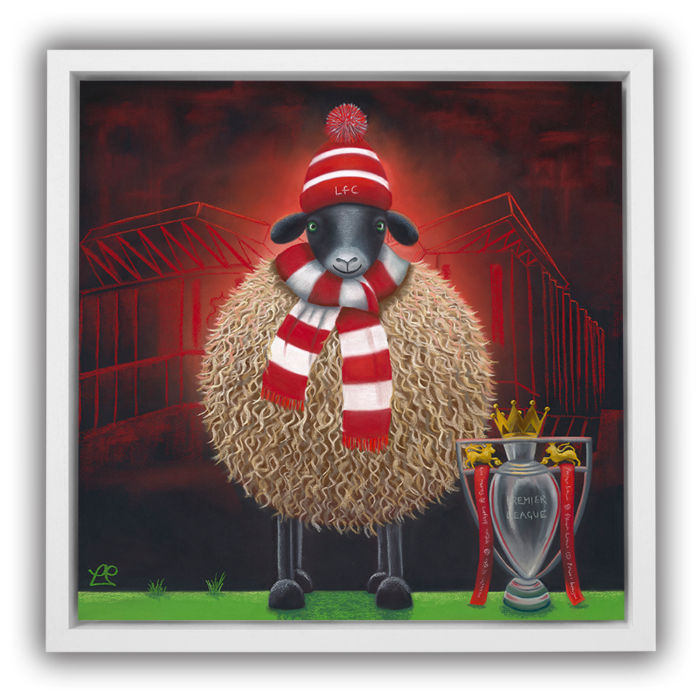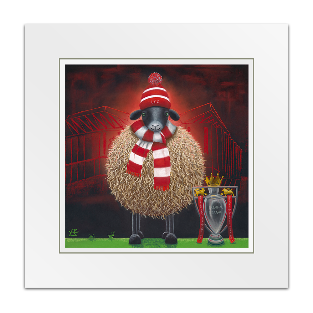 ‘Ewe’ll Never Walk Alone’ marks a significant moment in Liverpool FC’s history – the club’s 20th league title and the first in front of their home fans for 35 years. Dressed in red and white and set against the backdrop of Anfield, Lucy’s sheep stands tall beside the Premier League trophy. The piece captures the pride, passion and loyalty that define the club and its supporters. It’s the second in Lucy Pittaway’s football-inspired collection.
