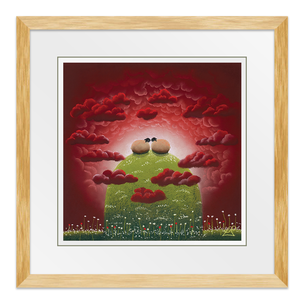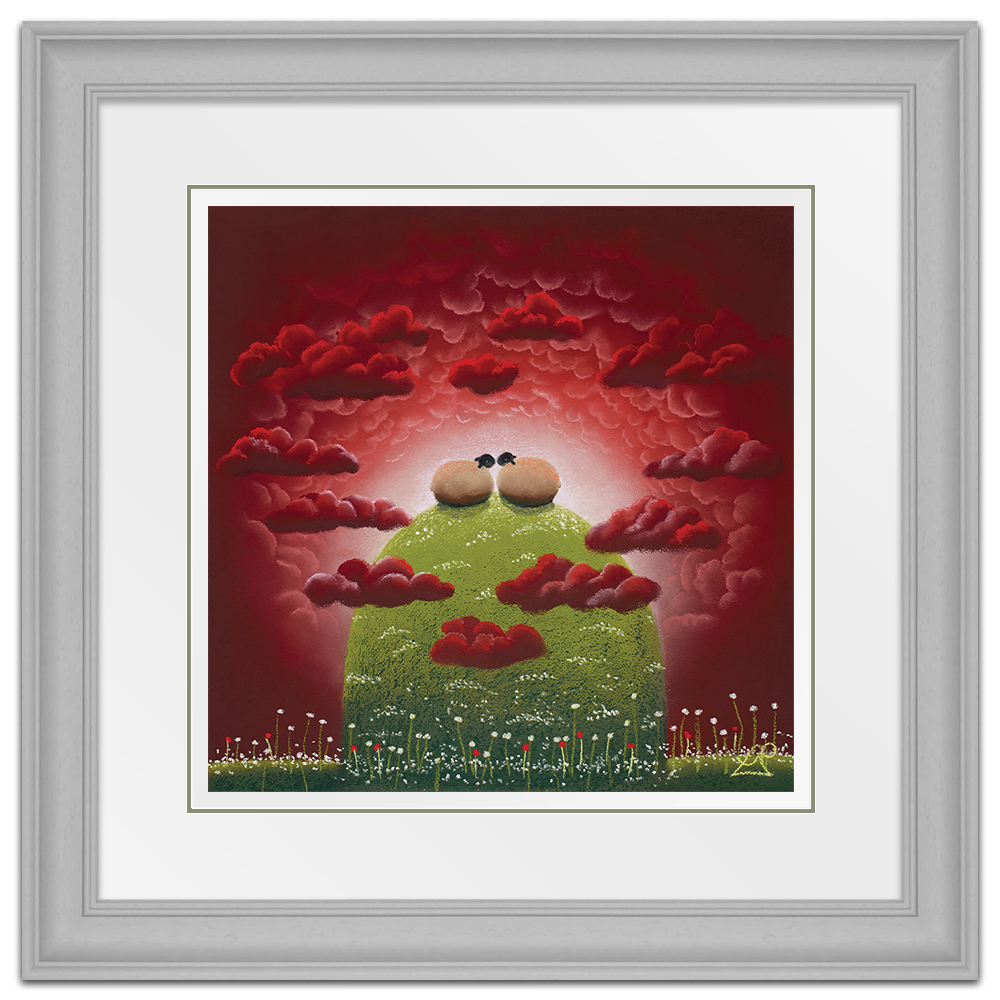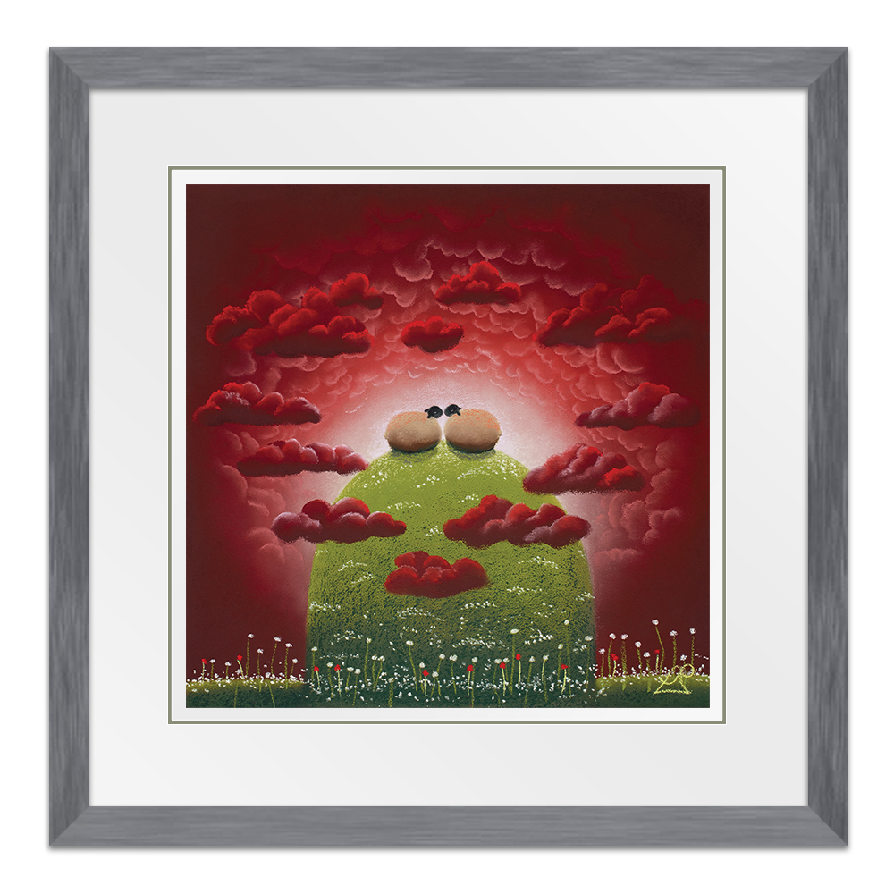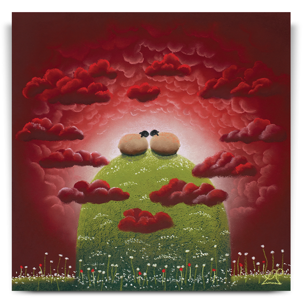 With their heads in the clouds, these two sheep feel on top of the world together. Surrounded by heart shaped clouds, the scene epitomises love and passion.