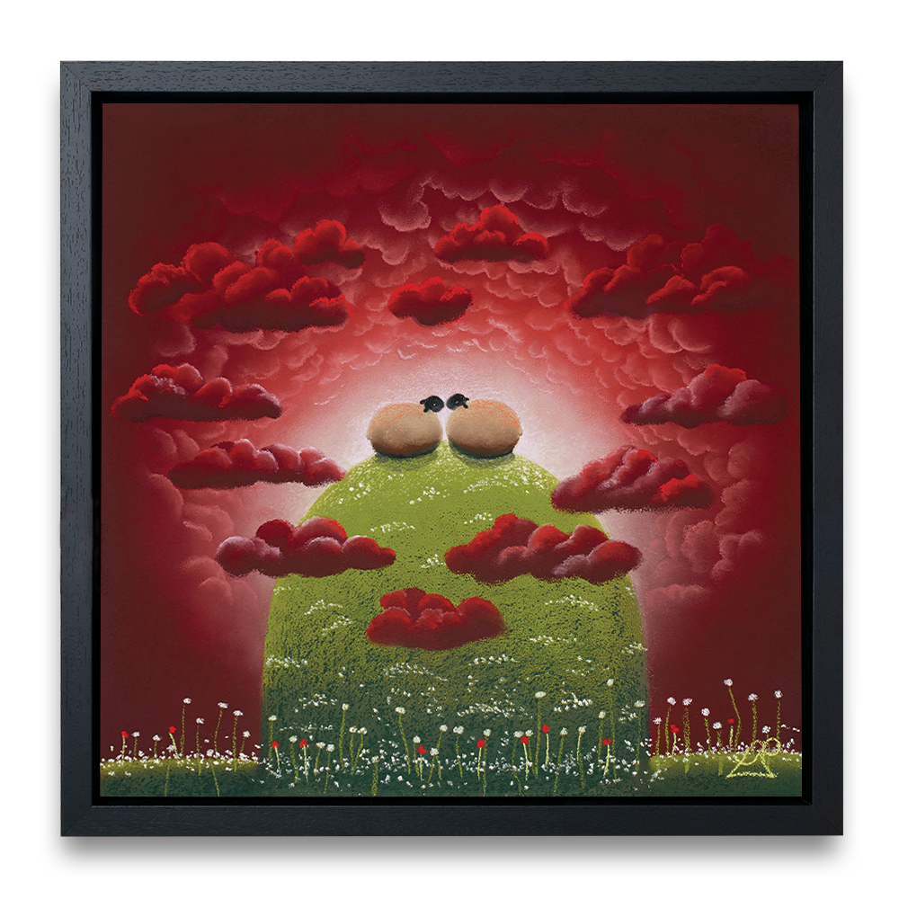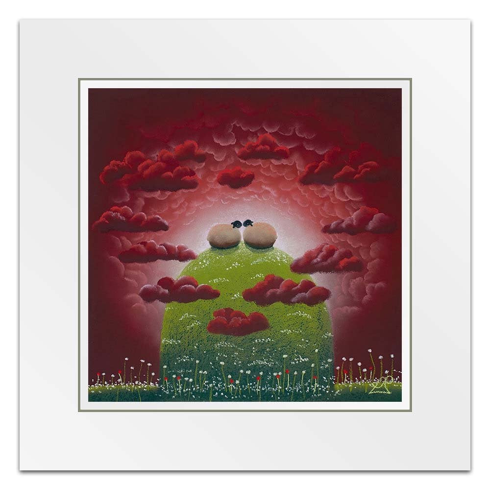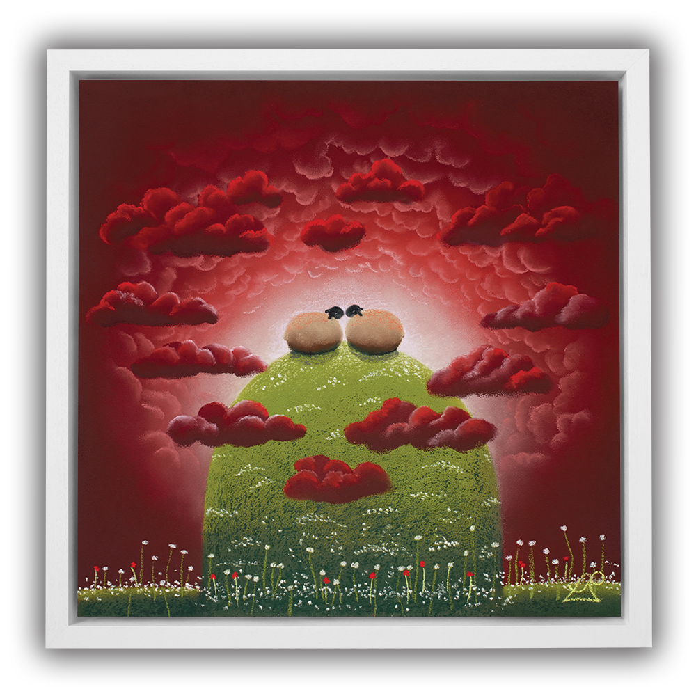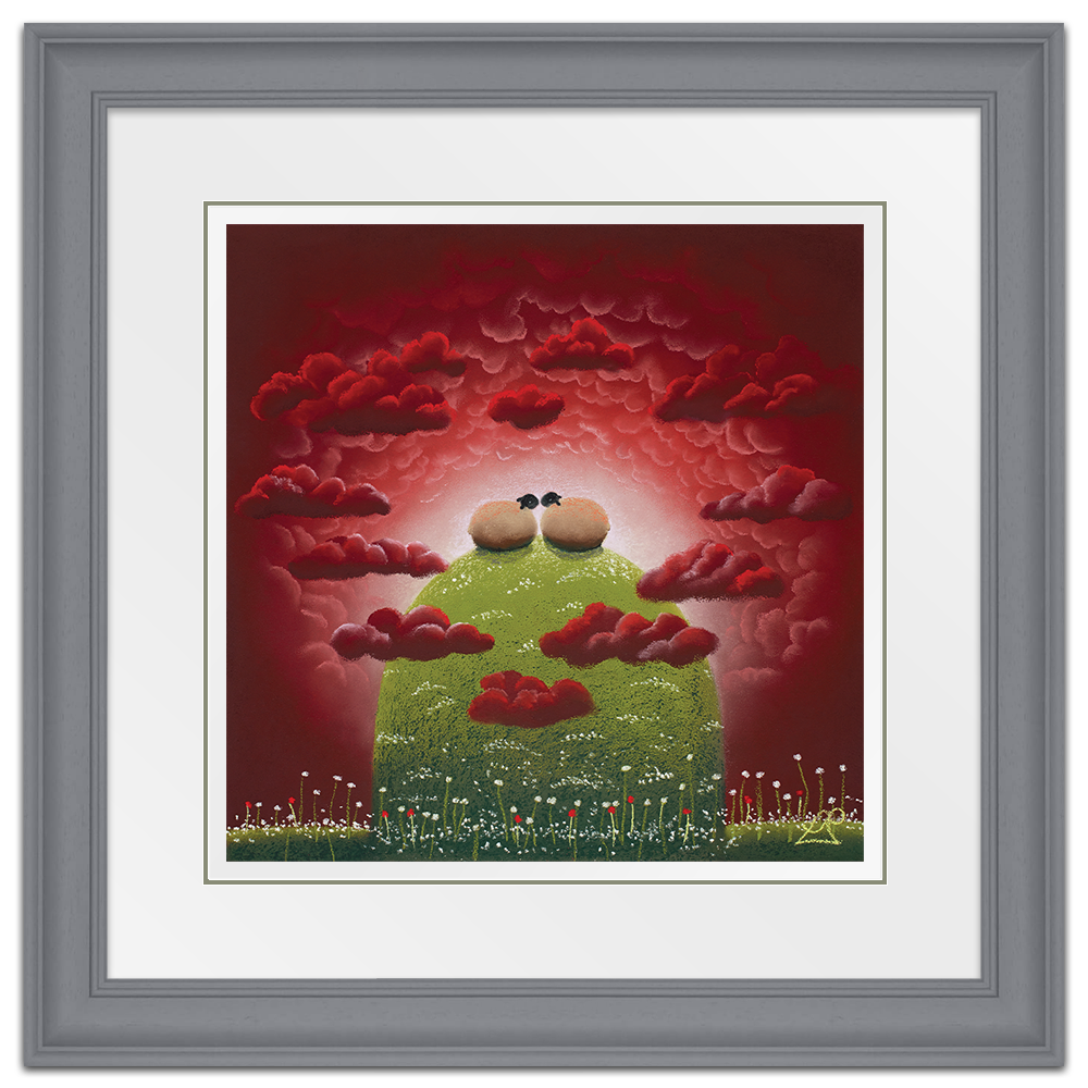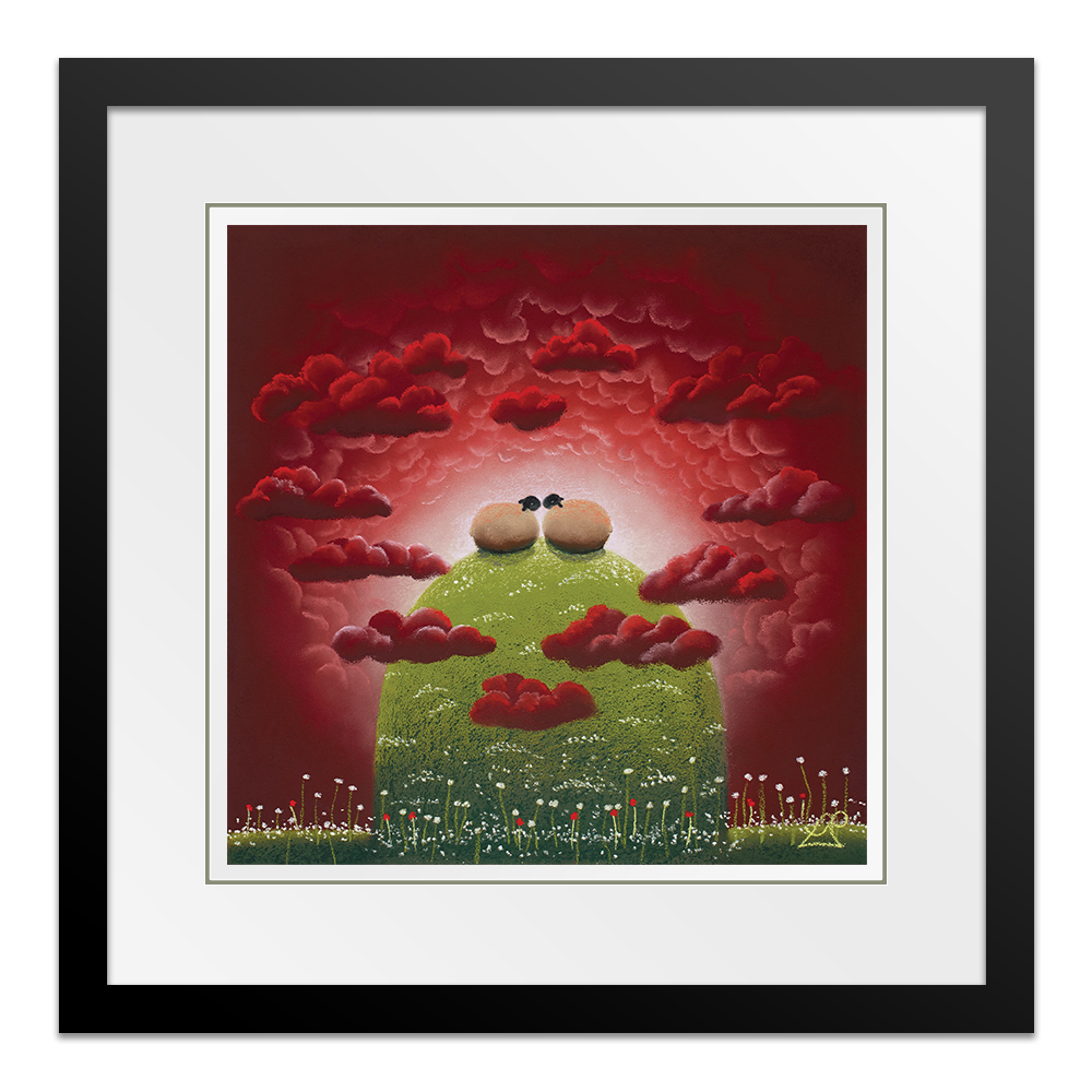With their heads in the clouds, these two sheep feel on top of the world together. Surrounded by heart shaped clouds, the scene epitomises love and passion.