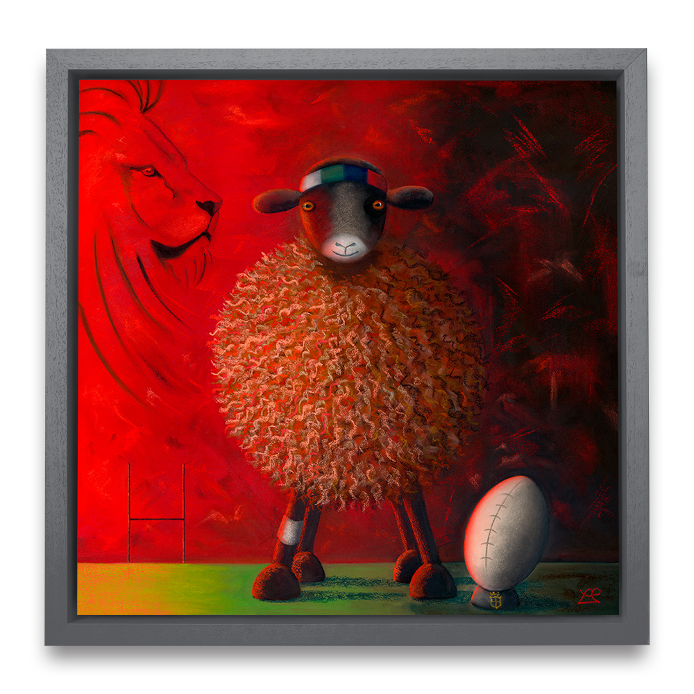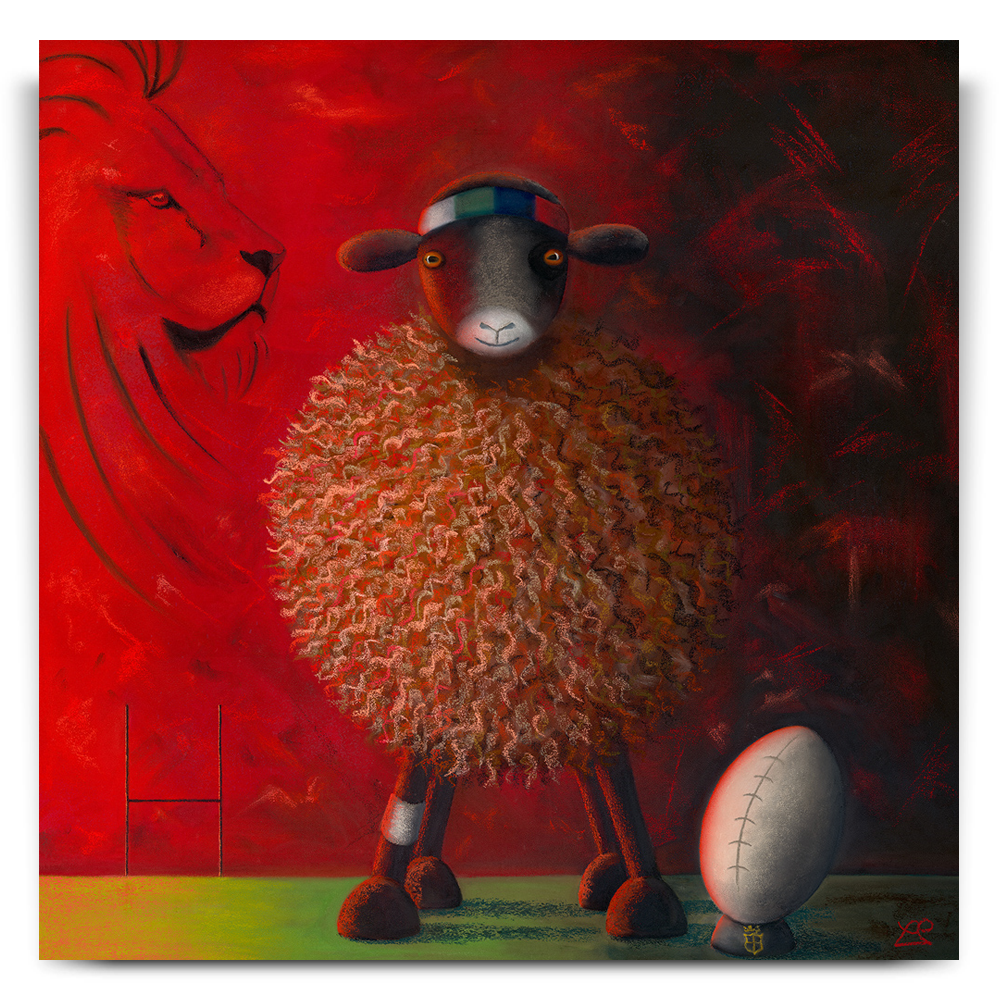 The Lions Ewe-nite marks Lucy Pittaway’s tribute to one of rugby’s greatest traditions: the British and Irish Lions tours of Australia, New Zealand and South Africa. A determined sheep, instantly recognisable to Lucy’s collectors, takes centre stage, adorned with a multi-coloured headband uniting the four home nations. A subtle shield on the rugby tee and the watchful lion set the scene, while the sheep’s black eye and bandage bring a light-hearted nod to the physical demands of the sport. Split between light and shadow, the painting reflects the day-and-night divide as teams and supporters follow the action on the far side of the world: a piece that captures the camaraderie, humour and pride that define every Lions tour.
