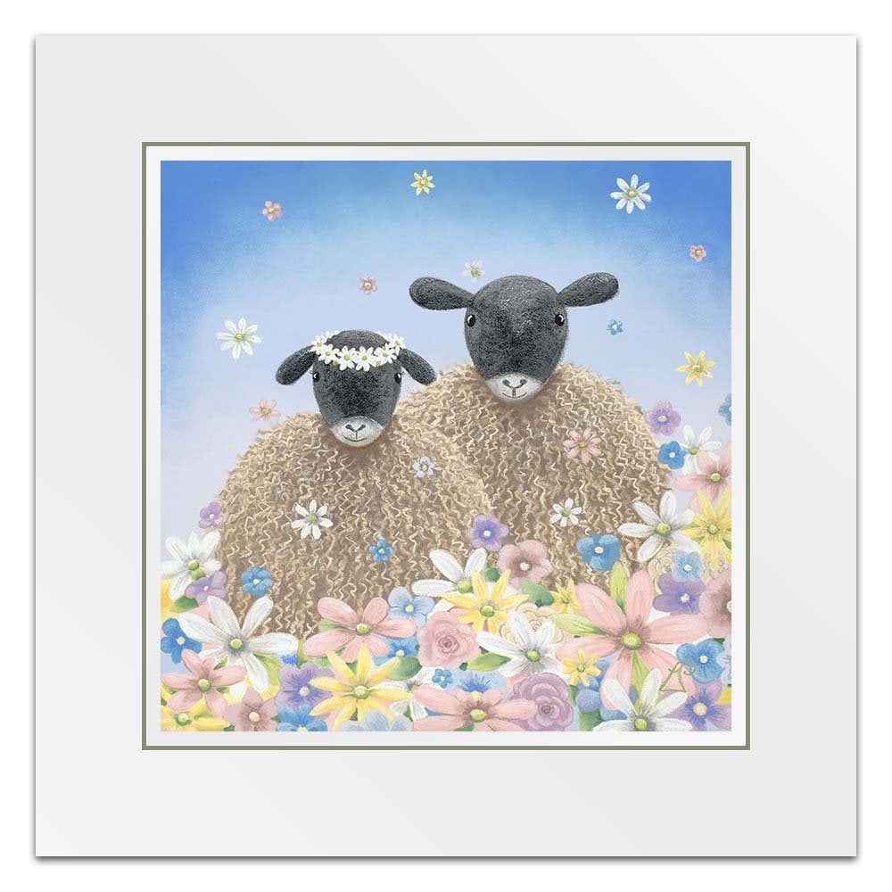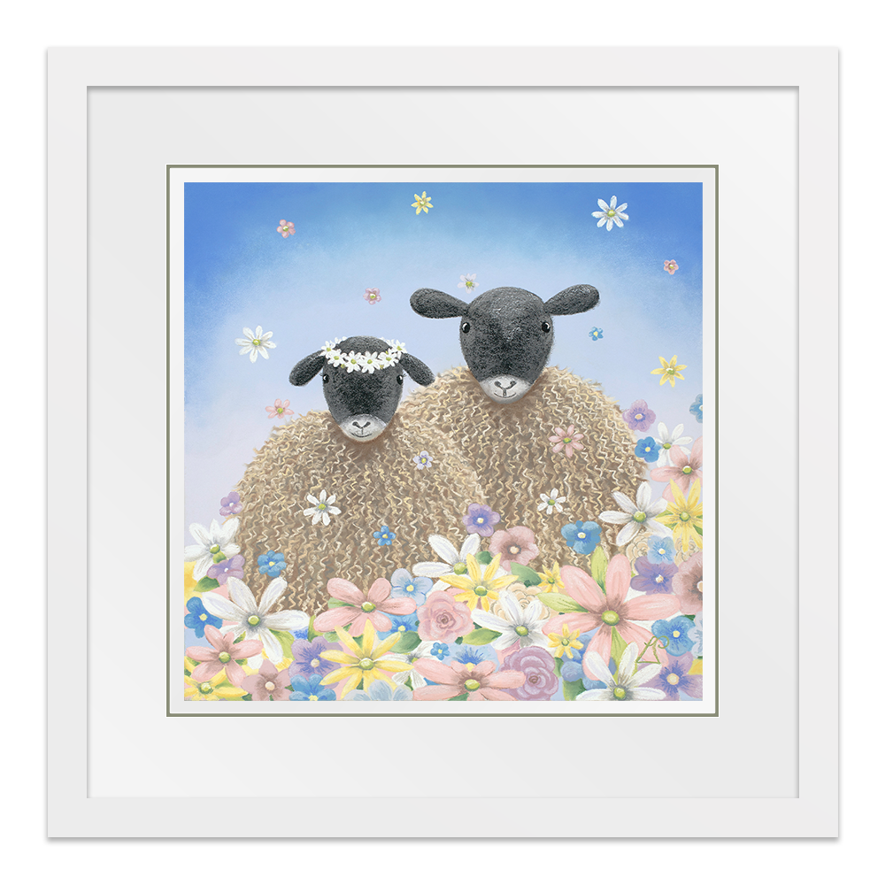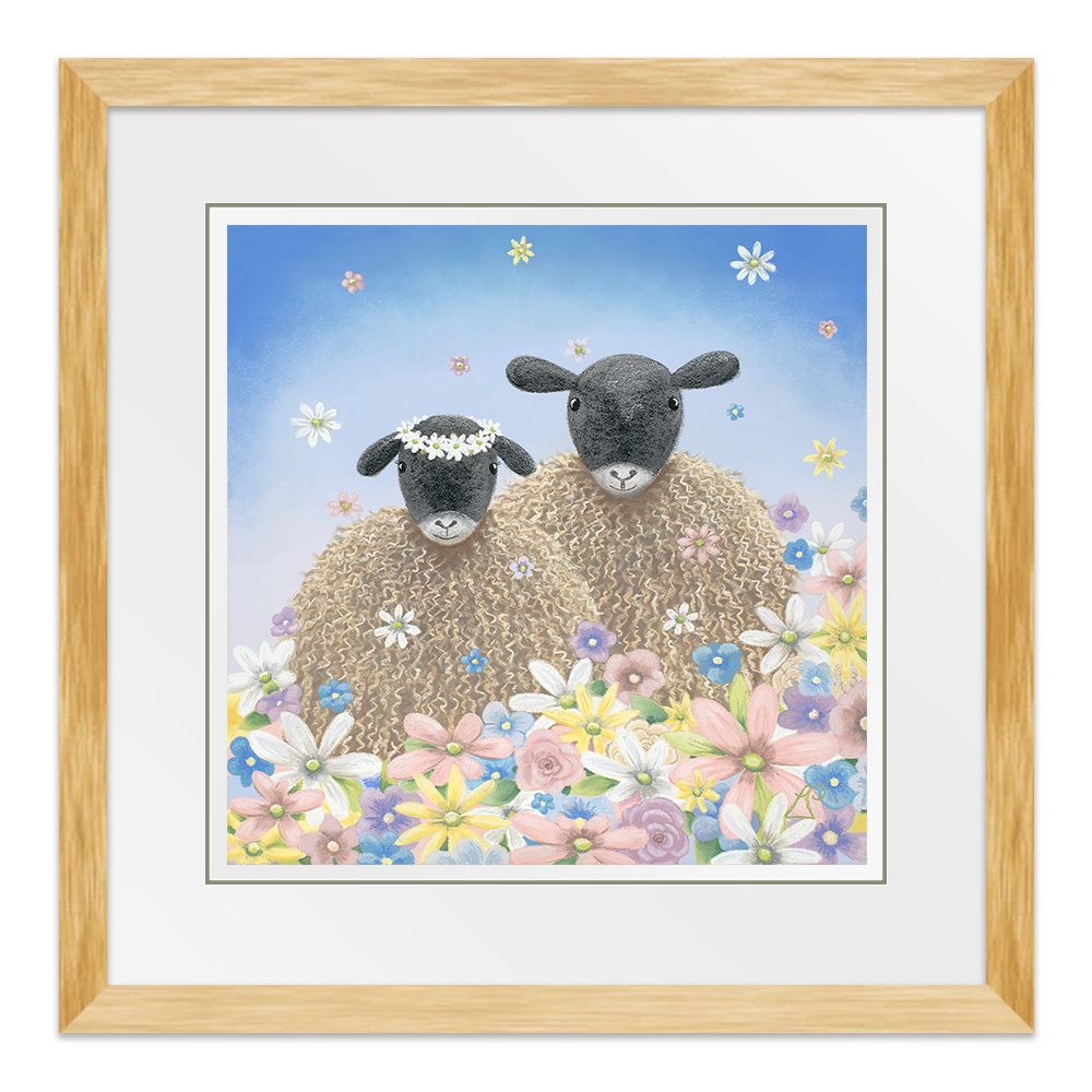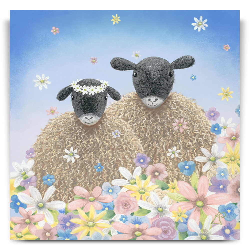 Perfect as a wedding gift, 'The One' features two sheep surrounded by flowers falling from the sky like confetti. One sheep wears a floral headdress of daisies.