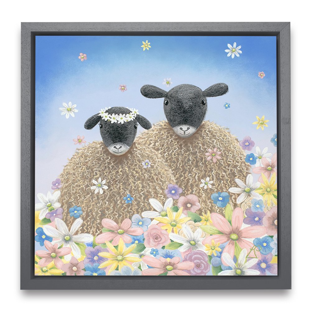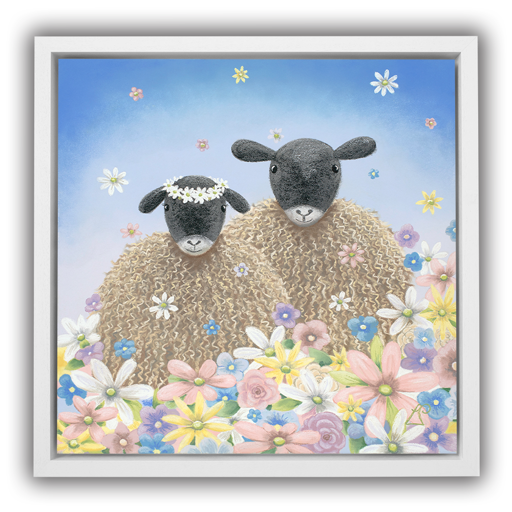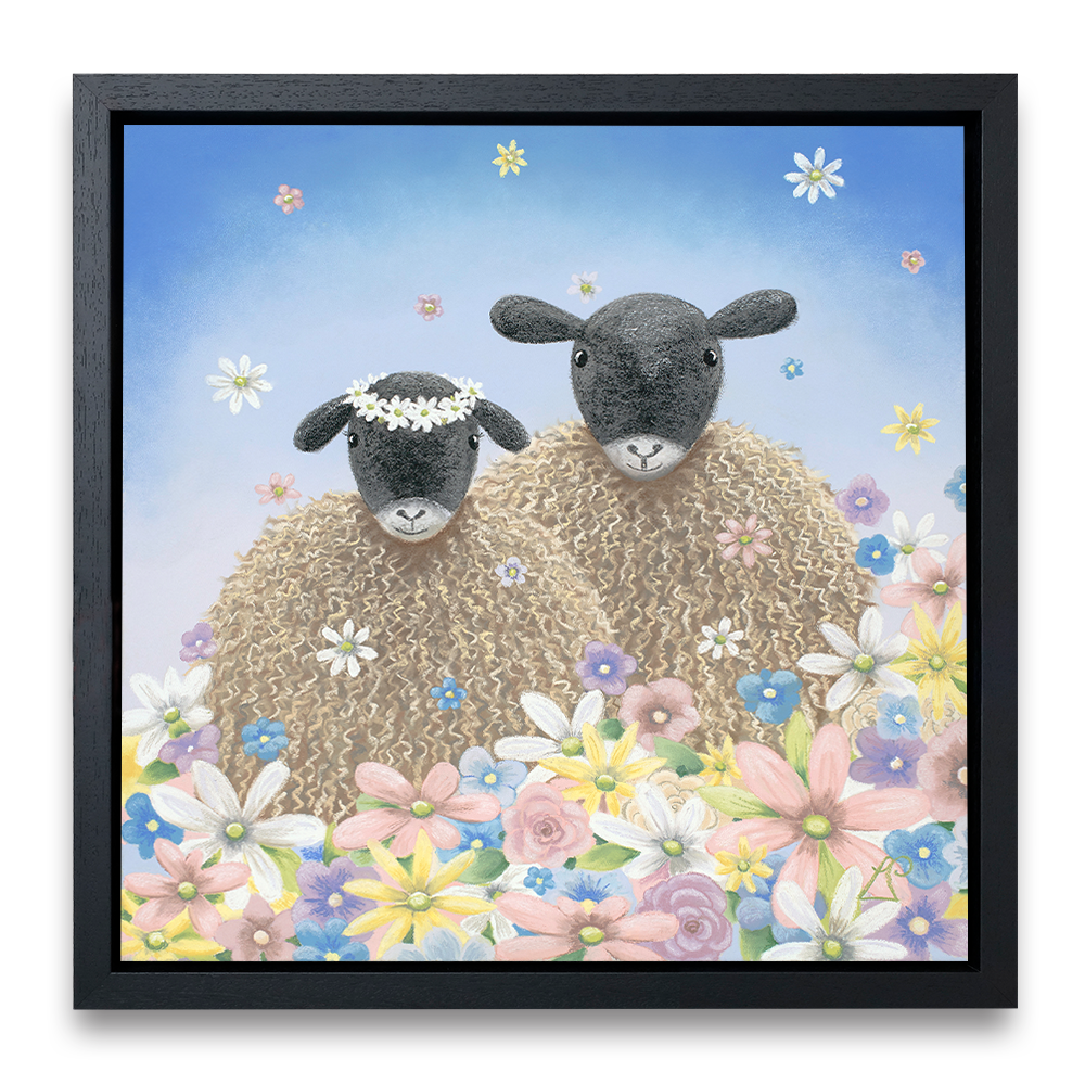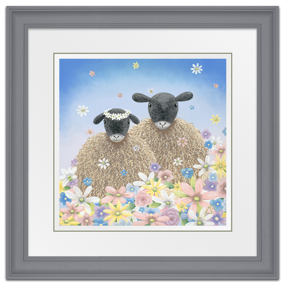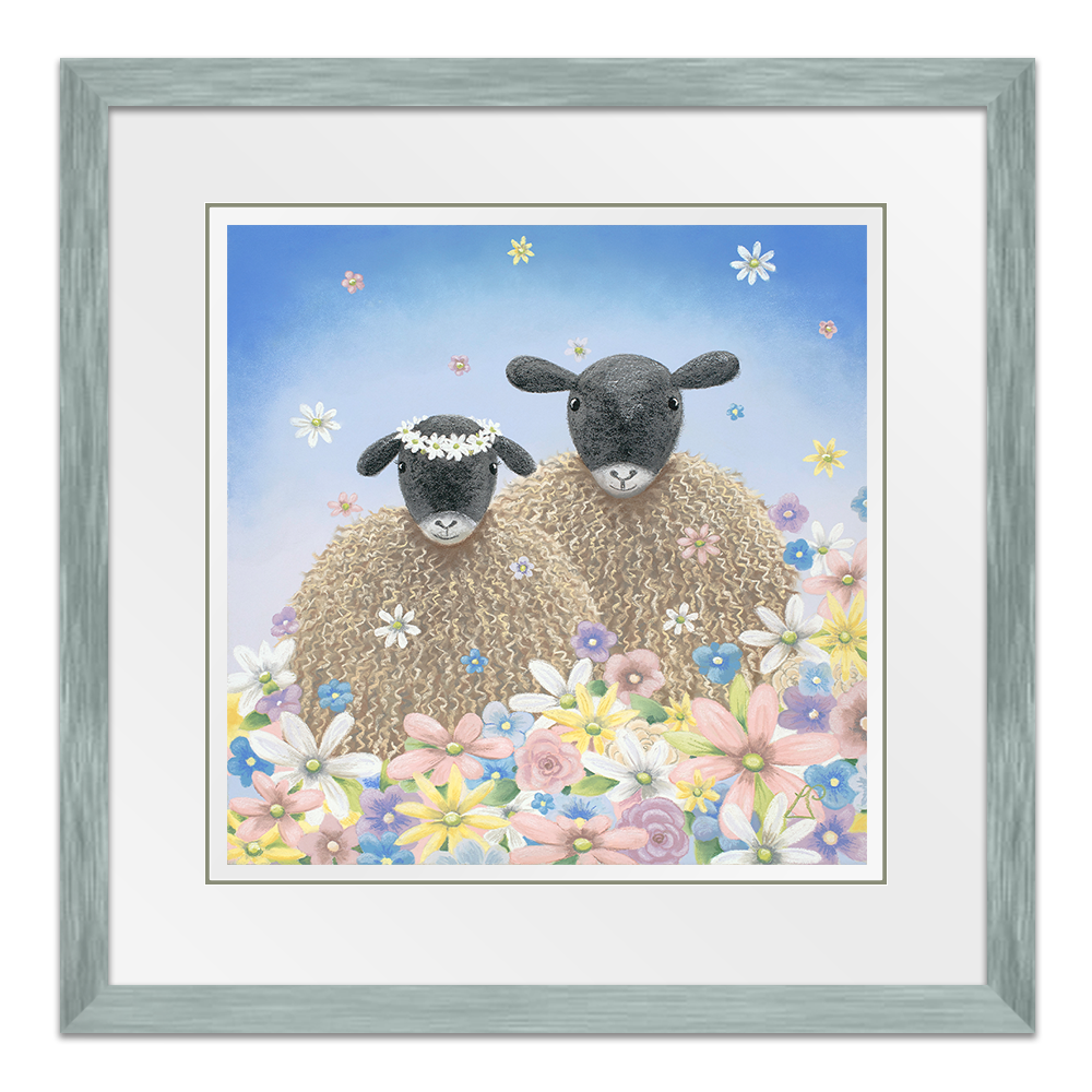 Perfect as a wedding gift, 'The One' features two sheep surrounded by flowers falling from the sky like confetti. One sheep wears a floral headdress of daisies.