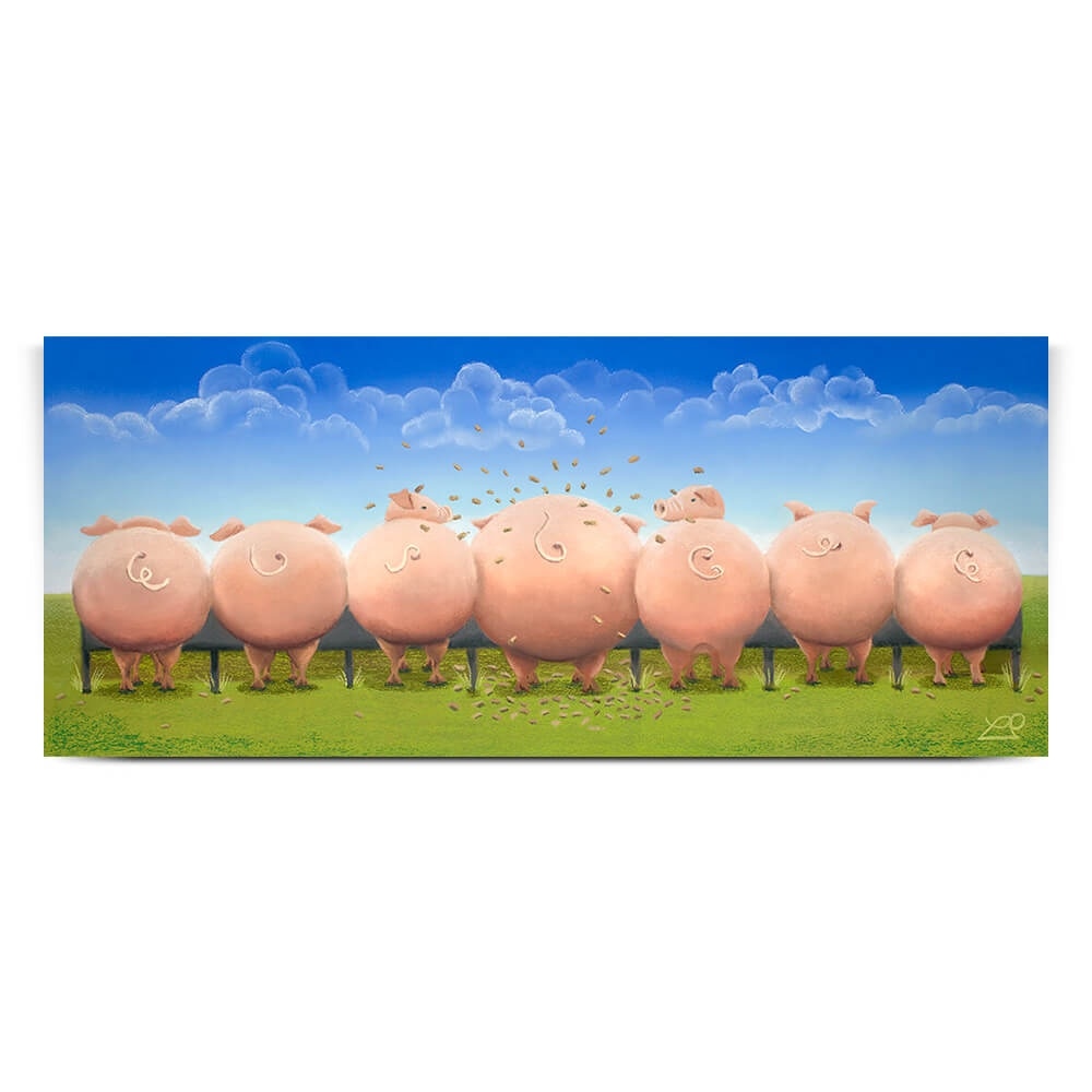 I loved creating this picture. I giggled to myself whilst drawing out the idea. The painting has one greedy pig in the centre that is eating fast and furiously trying to devour the pellets before the others. In the process the food is flying around, hitting the other pigs who seem less than impressed by their neighbour's table manners.
