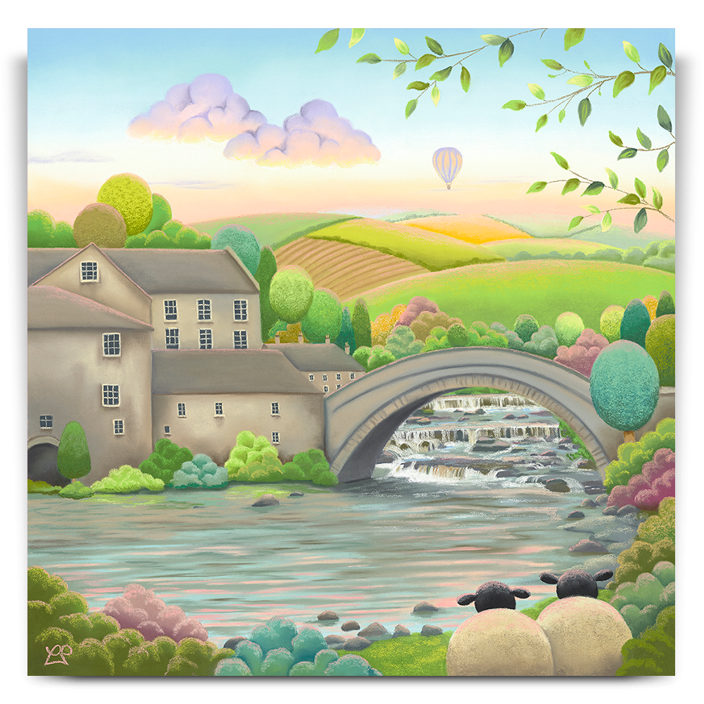 Set at Aysgarth Falls in North Yorkshire, this piece follows the River Ure as it moves under Yore Bridge and past Yore Mill. The mill and bridge give the scene its familiar setting, with the landscape opening into fields and gentle hills beyond. Two familiar sheep pause by the water as a hot air balloon rises in the distance, catching the first light of the day.