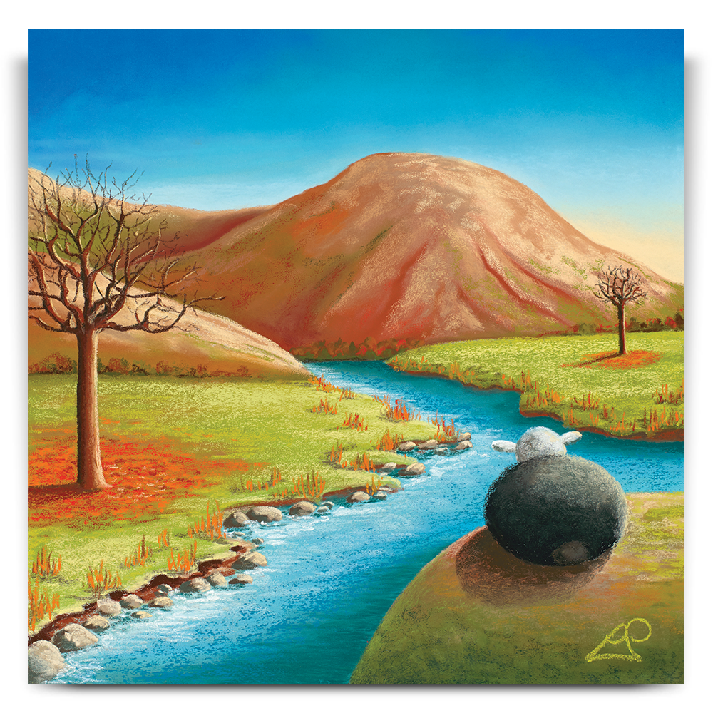 It's a stunning Autumnal day in the Cumbrian countryside. The rich earthy browns and rusty oranges of the trees and foliage, contrast beautifully with the turquoise sky and stream. This little Herdwick sheep is happy all by itself, enjoying the peace.