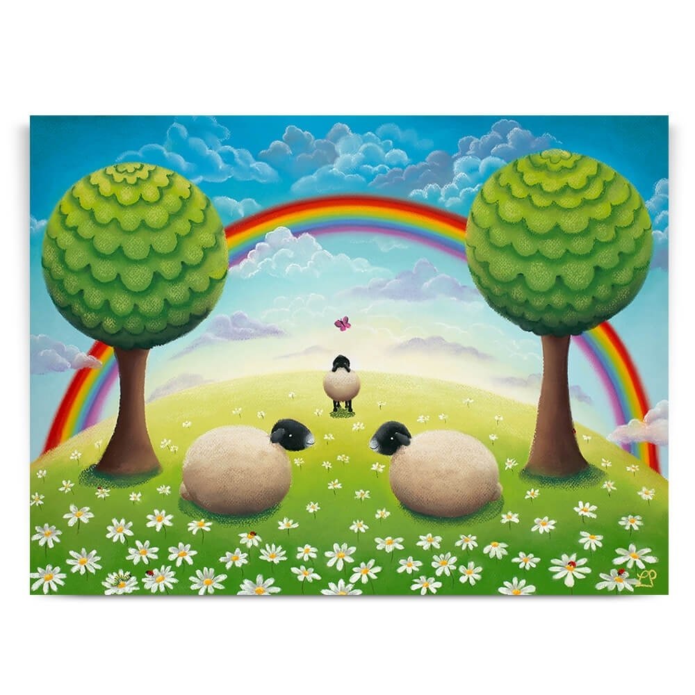 'Chasing Rainbows' is a bright and cheerful painting which reflects hope, positivity, childhood innocence and nature but most of all it is meant to bring a smile to a face.