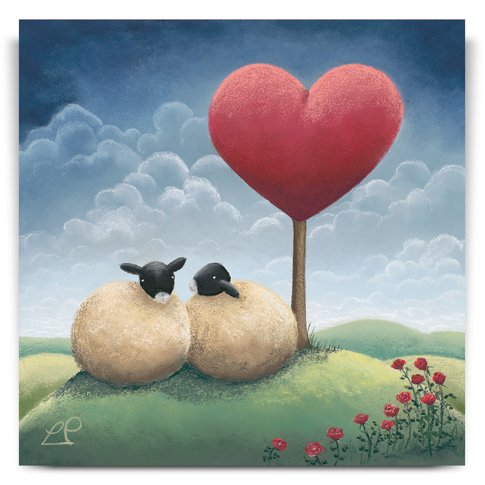 A couple of fluffy round sheep sit snuggled up together beneath a hear-shaped tree. They are surrounded by a dozen red roses, the perfect setting for this smitten couple.