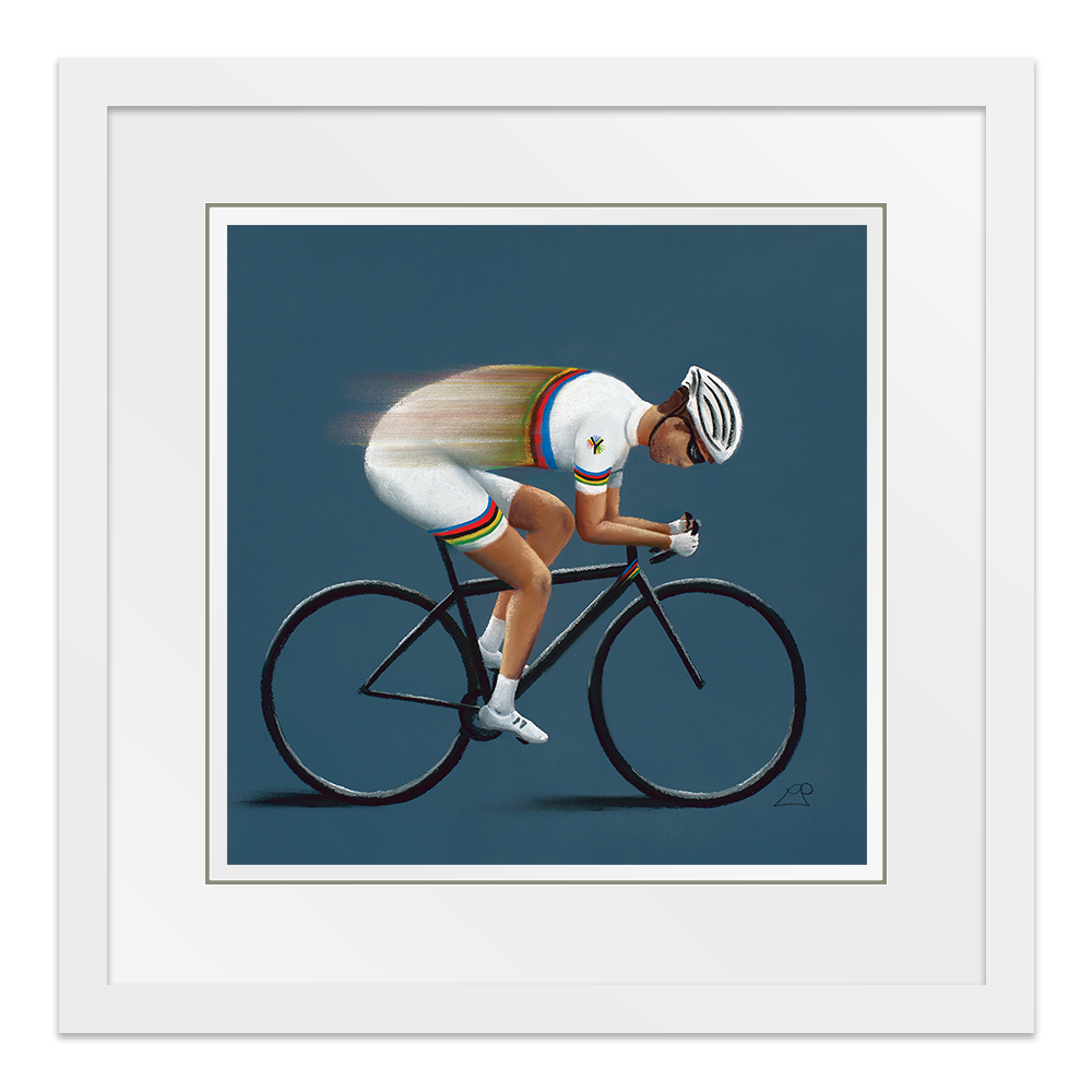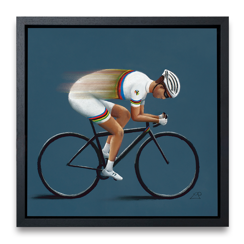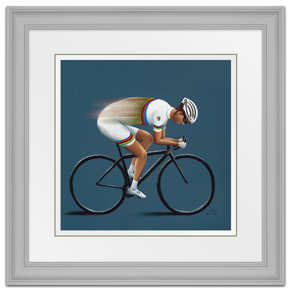 In stark contrast to the other pieces in the UCI collection, this features a single rider, proudly dressed in white and bearing the UCI World Championship rainbow stripes, which appear to blur behind him suggesting the speed these powerful riders can reach. His shirt bears the Yorkshire 2019 Road World Champs logo.
