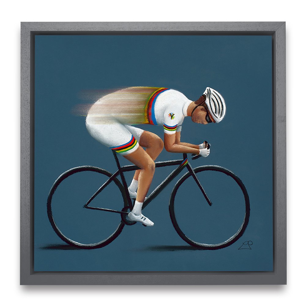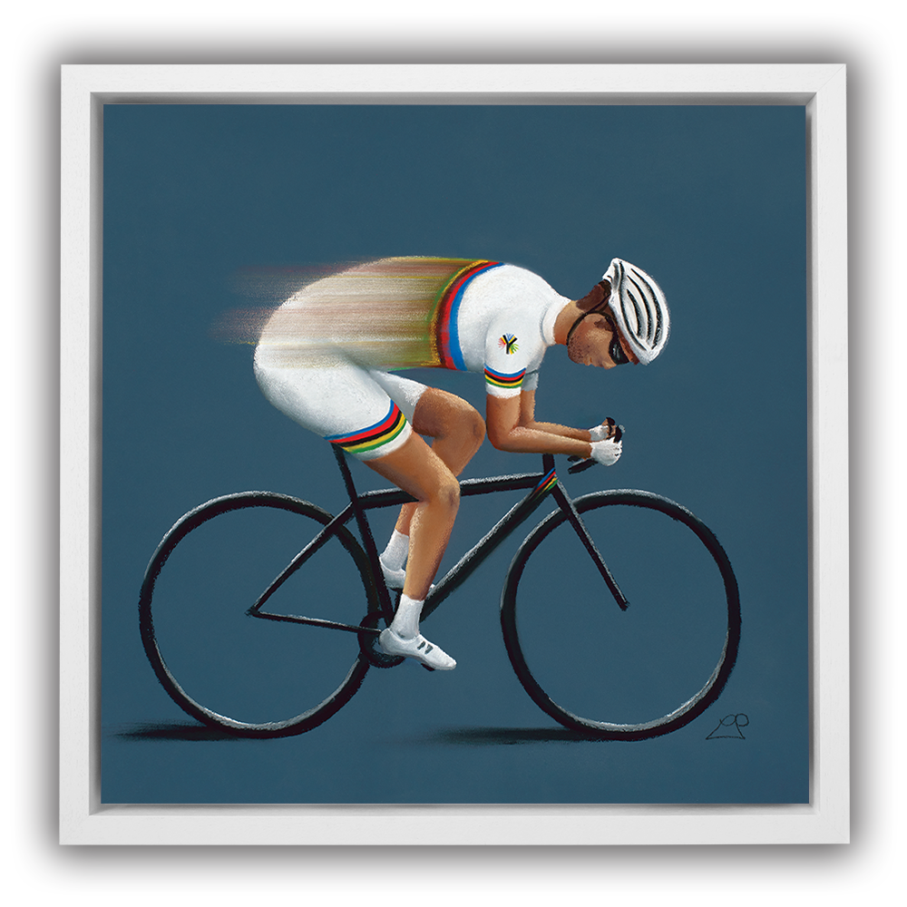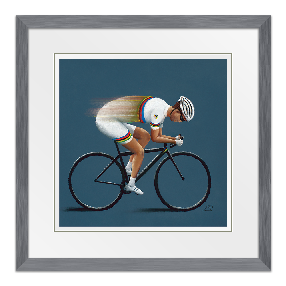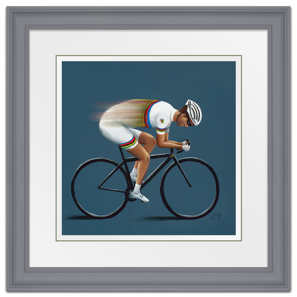 In stark contrast to the other pieces in the UCI collection, this features a single rider, proudly dressed in white and bearing the UCI World Championship rainbow stripes, which appear to blur behind him suggesting the speed these powerful riders can reach. His shirt bears the Yorkshire 2019 Road World Champs logo.