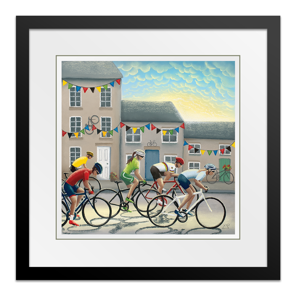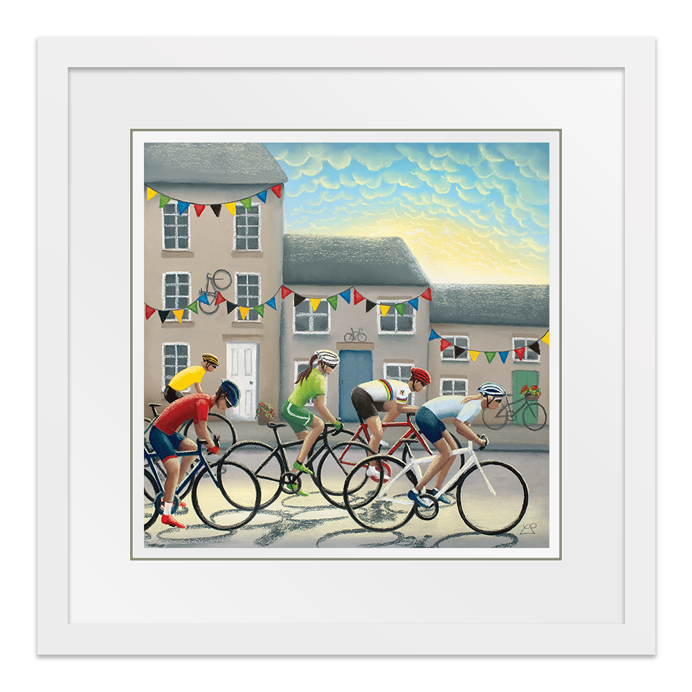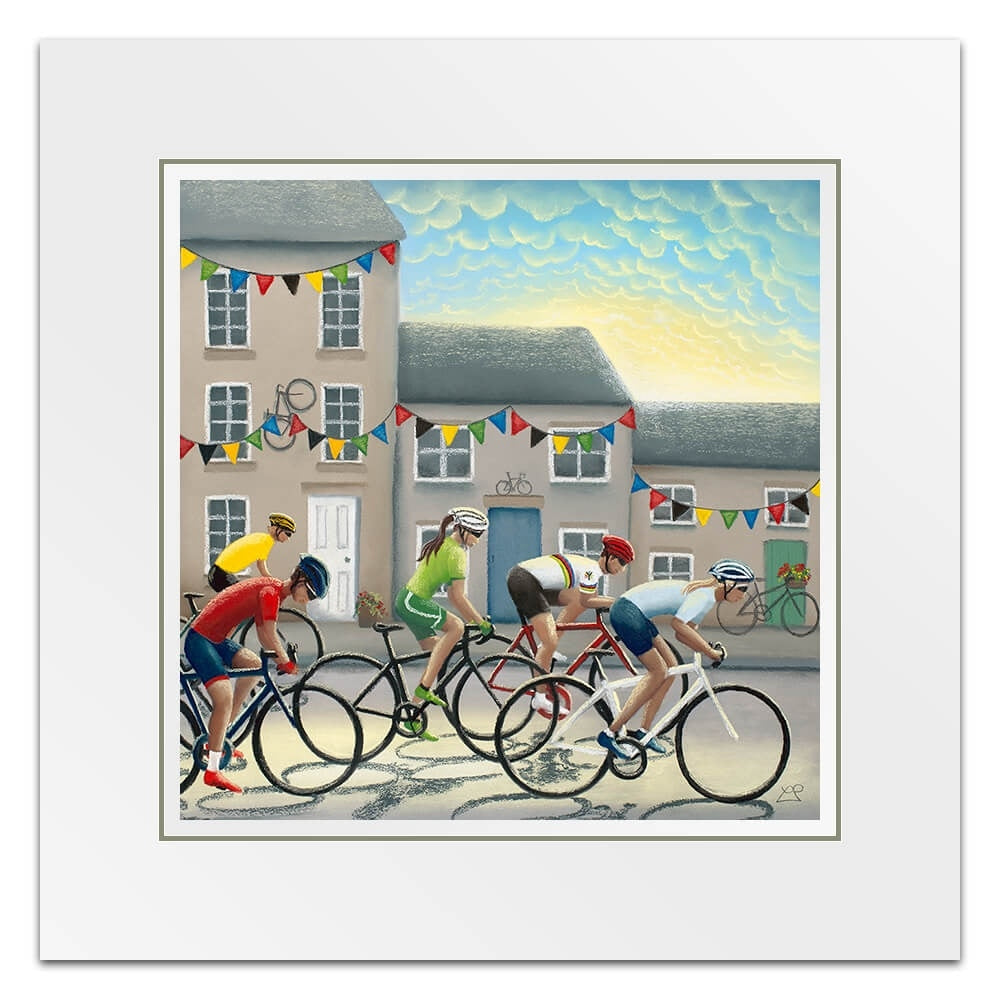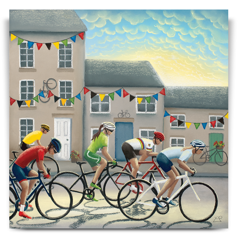 In 2019, Yorkshire hosted the UCI Road World Championships and as part of this, it also hosted the 'Team Trial Mixed Relay Race'. This picture includes male and female riders battling it out against one another in front of a Yorkshire town backdrop, decorated with bunting and bikes in support of the riders as they flash through at speed.